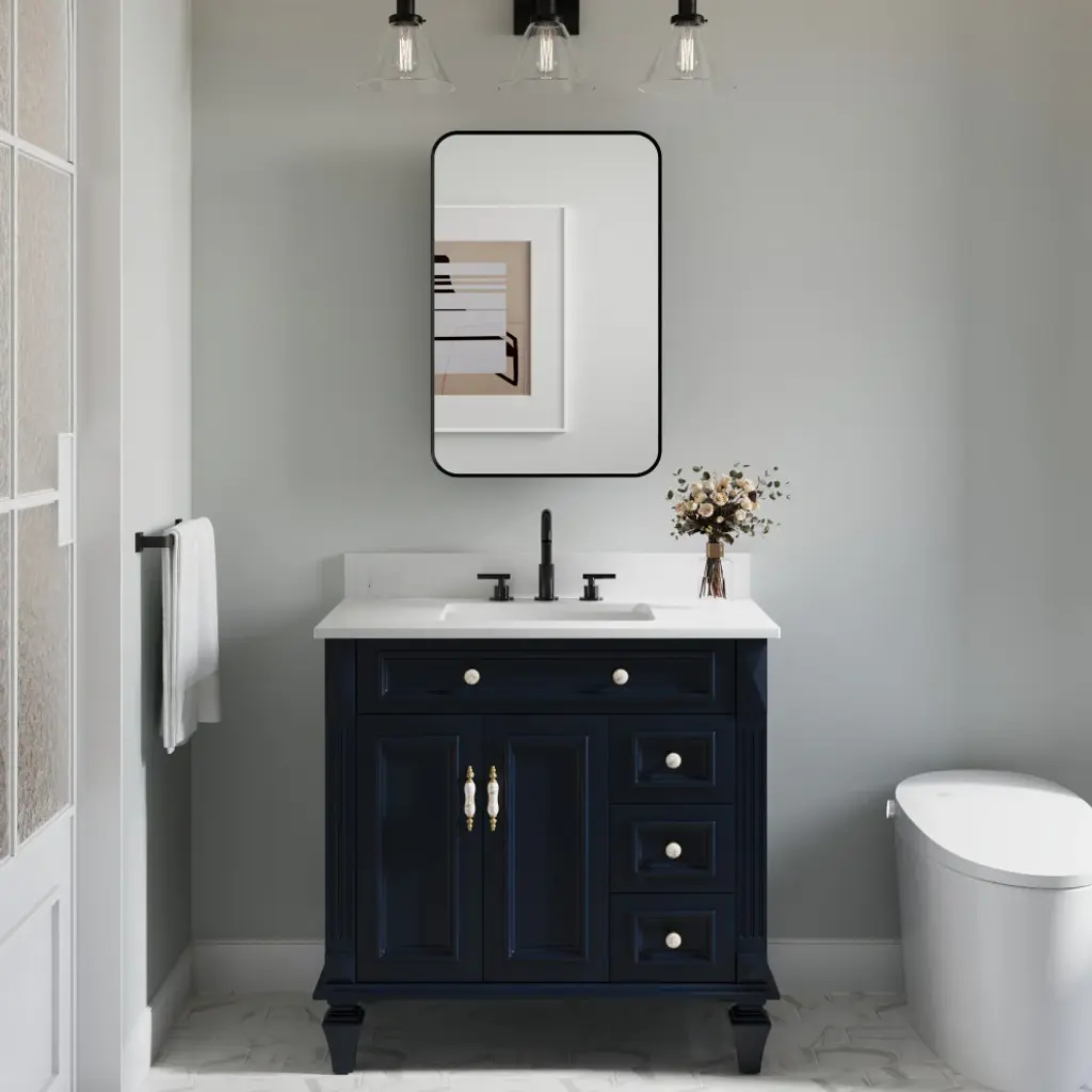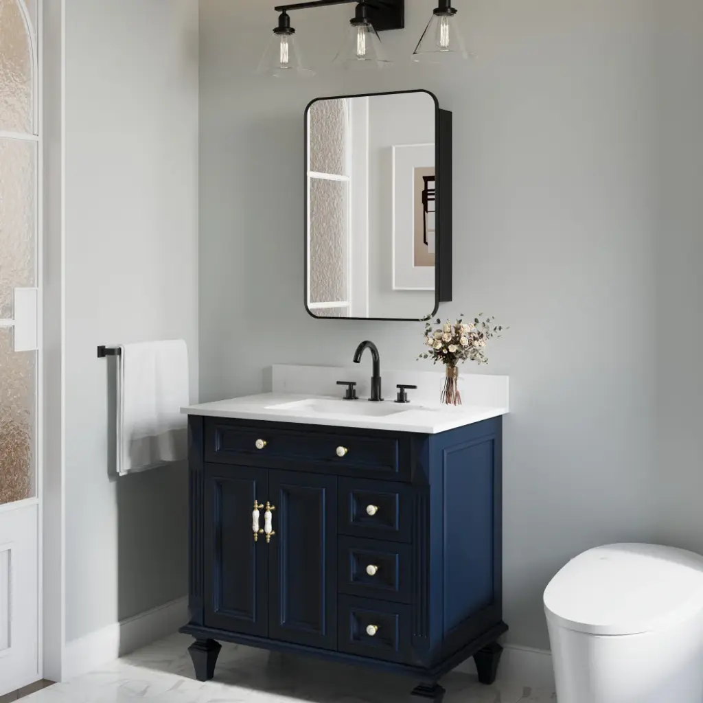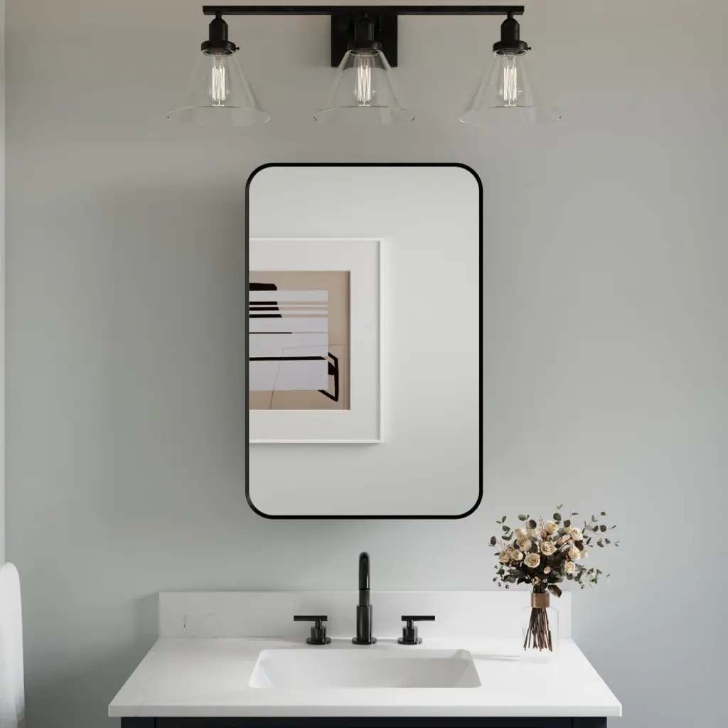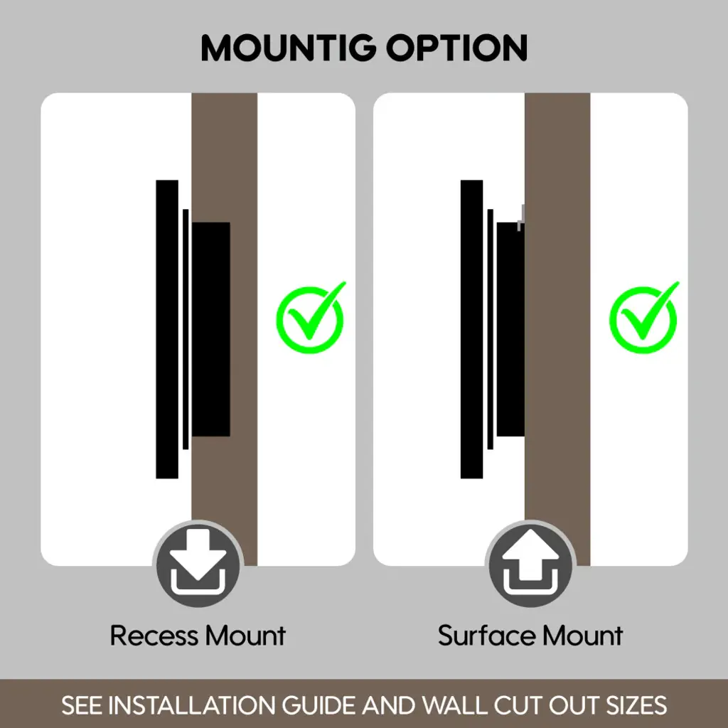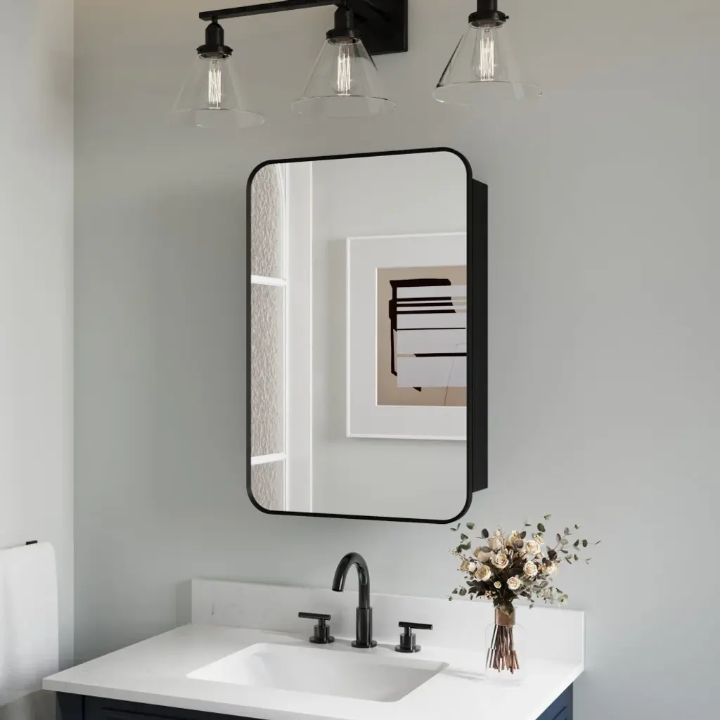 • • • Product Features: Premium Aluminum Alloy Frame: Crafted with corrosion-resistant, anti-rust, and waterproof aluminum alloy for long-lasting durability and a stylish look.Soft-Close Cabinet Door Hinge: Reduces noise and protects the cabinet door for prolonged use, ensuring a smooth and quiet bathroom experience.All-Glass Construction: Features a mirrored front panel, mirrored back panel inside the door, and a glass backing panel for a premium, seamless appearance.Explosion-Proof Glass Film: Ensures safety by preventing shattered glass from scattering in the event of impact.Dual Installation Options: Choose between wall-mounted or recessed installation to suit your bathroom layout and design preferences.Reversible Door Design: The door can be installed to open left or right by reversing its 180-degree orientation, offering flexibility for different spaces.Tempered Adjustable Glass Shelves: Sturdy and adjustable shelves allow you to customize storage for toiletries and personal items with ease.Fully Assembled: Ready to install right out of the box, saving you time and effort.• • • Specifications:Material: Aluminum alloy frame with tempered glass panelsShelves: Adjustable tempered glassInstallation Options: Wall-hanging or recessedDimensions: 20" x 30" x 4-3/4"Rough-in Size: 19-1/16" x 24-1/16" x 3-13/16"Finish: Black