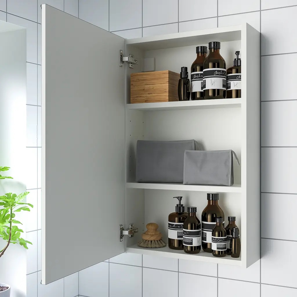 ENHET Mirror cab/1 door - white 18x6 3/4x30 ". This wall cabinet with 2 shelves puts bottles, boxes and things often used within easy reach. The unique wedge dowels make assembly easy and the fittings are nearly invisible. Screws for connecting several cabinets included.