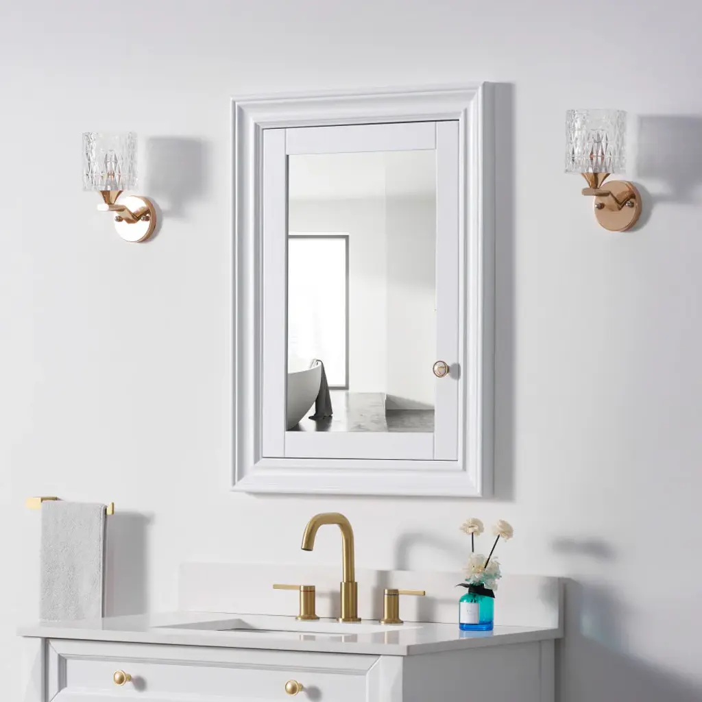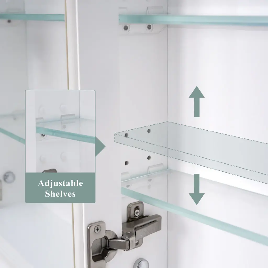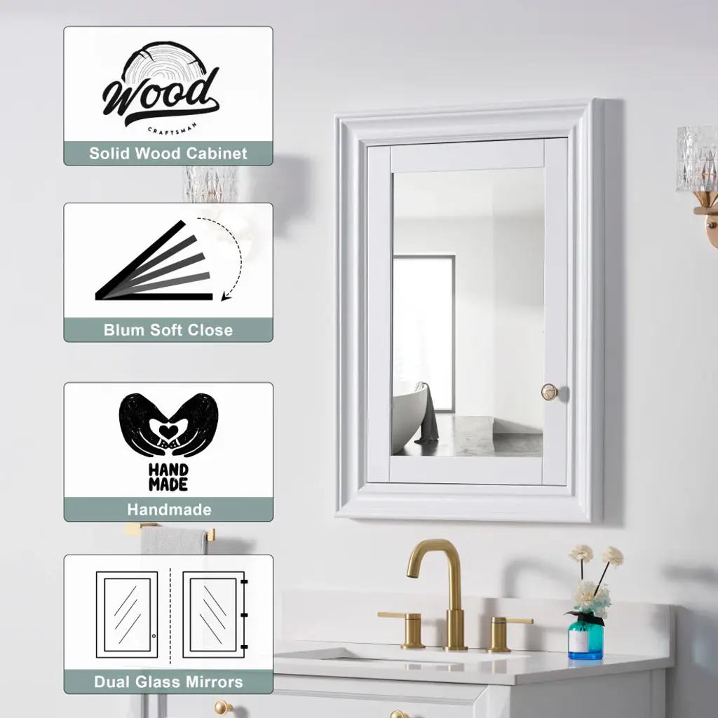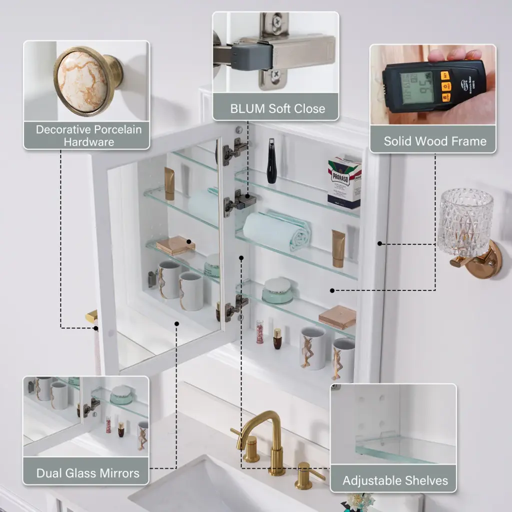 1. Durable Solid Wood Frame: Constructed from high-quality, popular wood, this mirror promises longevity and a timeless look.2. Soft-Close Door: Features soft-close door mechanism, ensuring quiet and gentle closing every time.3. Ample Storage: Equipped with 3 adjustable glass shelves inside, providing plenty of storage space for your bathroom essentials.4. Premium Hardware: Includes metal alloy hardware with decorative porcelain, adding a touch of elegance to the overall design.5. Austria BLUM Soft-Close Hinges System: High-quality soft-close hinges from Austria''s renowned BLUM, ensuring durability and smooth operation.6. Recess Mount Installation: Designed for a sleek, flush mount, making it a seamless addition to your wall.