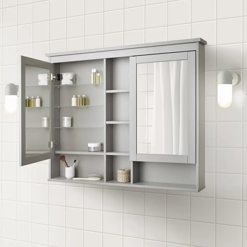 HEMNES Mirror cabinet with 2 doors - gray 47 1/4x38 5/8 ". The adjustable shelves are extra heat- and impact-resistant and have a high load-bearing capacity since they are made of tempered glass. The mirror comes with safety film on the back, which reduces the risk of injury if the glass is broken.