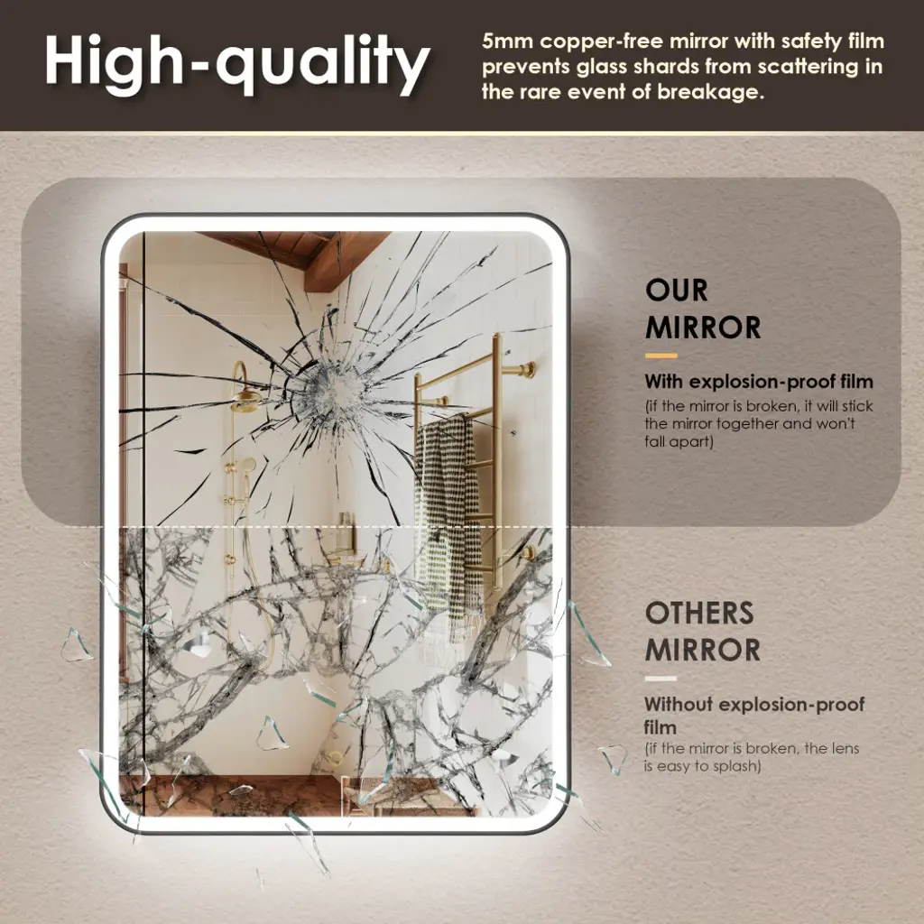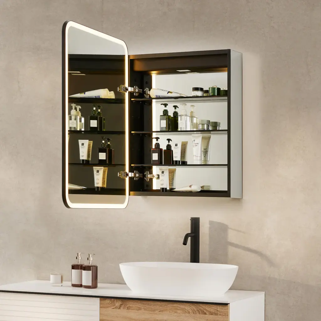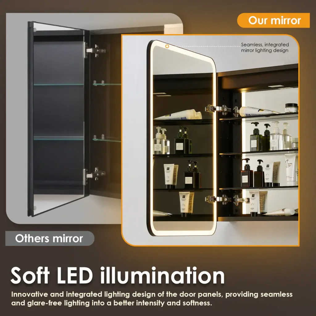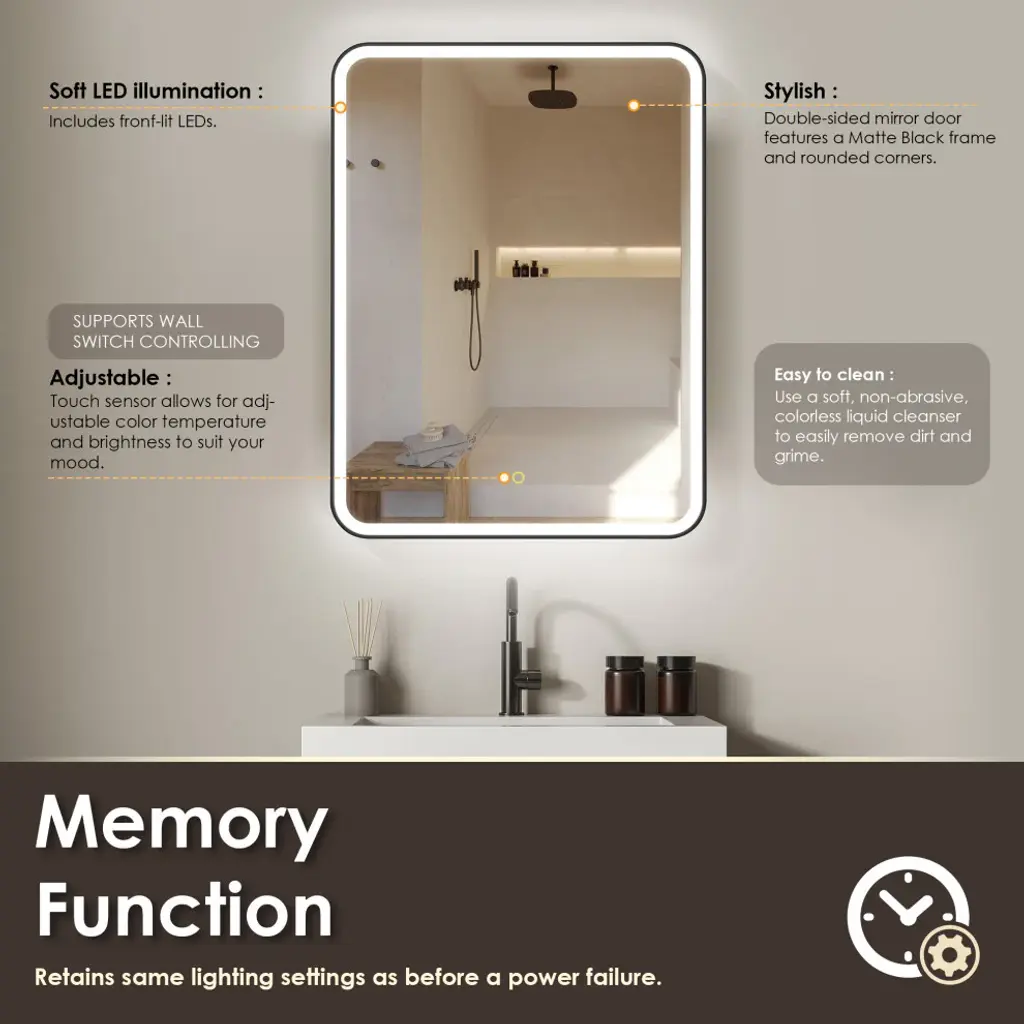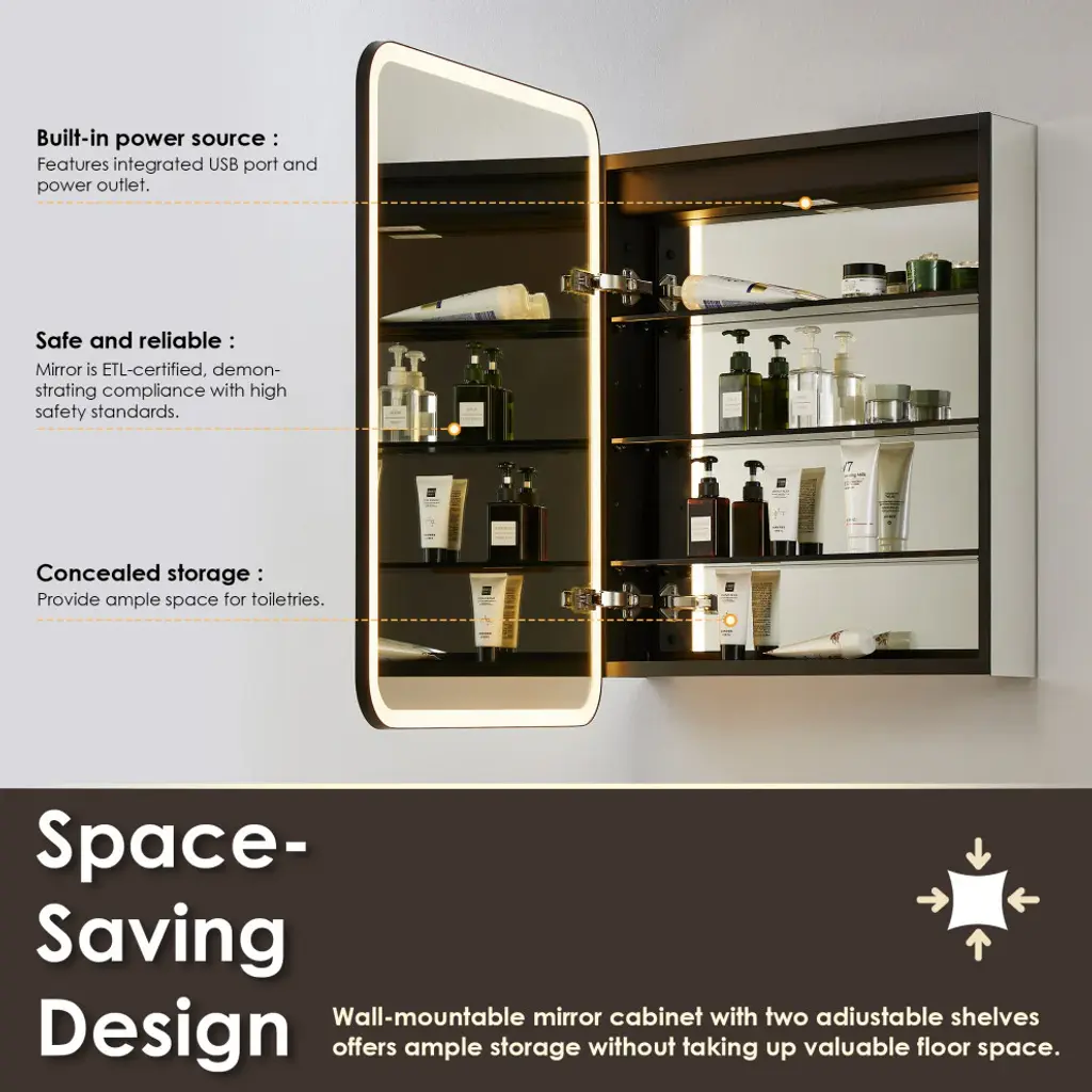Our Ostaria LED Medicine Cabinet is the height of modern elegance, engineered with an emphasis on safety and sophistication. Adjustable LED lights with touch-sensor technology offer soft, atmospheric illumination, while the convenient memory feature recalls your preferred settings. And with integrated power outlets, your styling tools will be in easy reach. Behind the soft-closing door lies a spacious cabinet with three height-adjustable shelves, providing customizable storage to keep your essentials organized and at your fingertips.FeaturesHigh-quality: 5mm copper-free mirror with safety film prevents glass shards from scattering in the rare event of breakage.Soft LED illumination: Innovative and integrated lighting design of the door panels, providing seamless and glare-free lighting into a better intensity and softness.Adjustable: Touch sensor allows for adjustable color temperature and brightness to suit your mood. oTap lightly for 3 color temperature changes (6000k/cold, 4000k/natural, 3000k/warm).oLong-press for brightness adjustment (10%-100%).Stylish: Double-sided LED mirror door features a Matte Black frame and rounded corners. Durable: Aluminum frame with anodized coating provides a decorative, corrosion-resistant finish.Concealed storage: Soft-closing door offers smooth opening and closing, while 3 height-adjustable, black tempered glass shelves (8mm thickness) provide ample space for toiletries.Built-in power source: Features integrated USB port and power outlet.Memory function: Retains same lighting settings as before a power failure.Waterproof: Tidy, fully enclosed alloy-coated back sheet is rated IP44 waterproof.Easy installation: Mirror is designed to be seamlessly surface-mounted or recess-mounted, and supports wall switch controlling.Safe and reliable: Mirror is ETL-certified, demonstrating compliance with high safety standards.Easy to clean: Use a soft, non-abrasive, colorless liquid cleanser to easily remove dirt and grime.Versatile: Fits a variety of decor styles (modern, glam, industrial, farmhouse, rustic).Multiple sizes: Choose from 3 different sizes to suit your unique space. Limited 1-year warranty: Purchase with complete peace of mind.