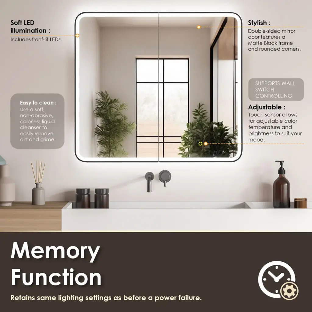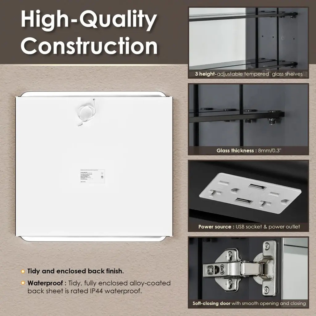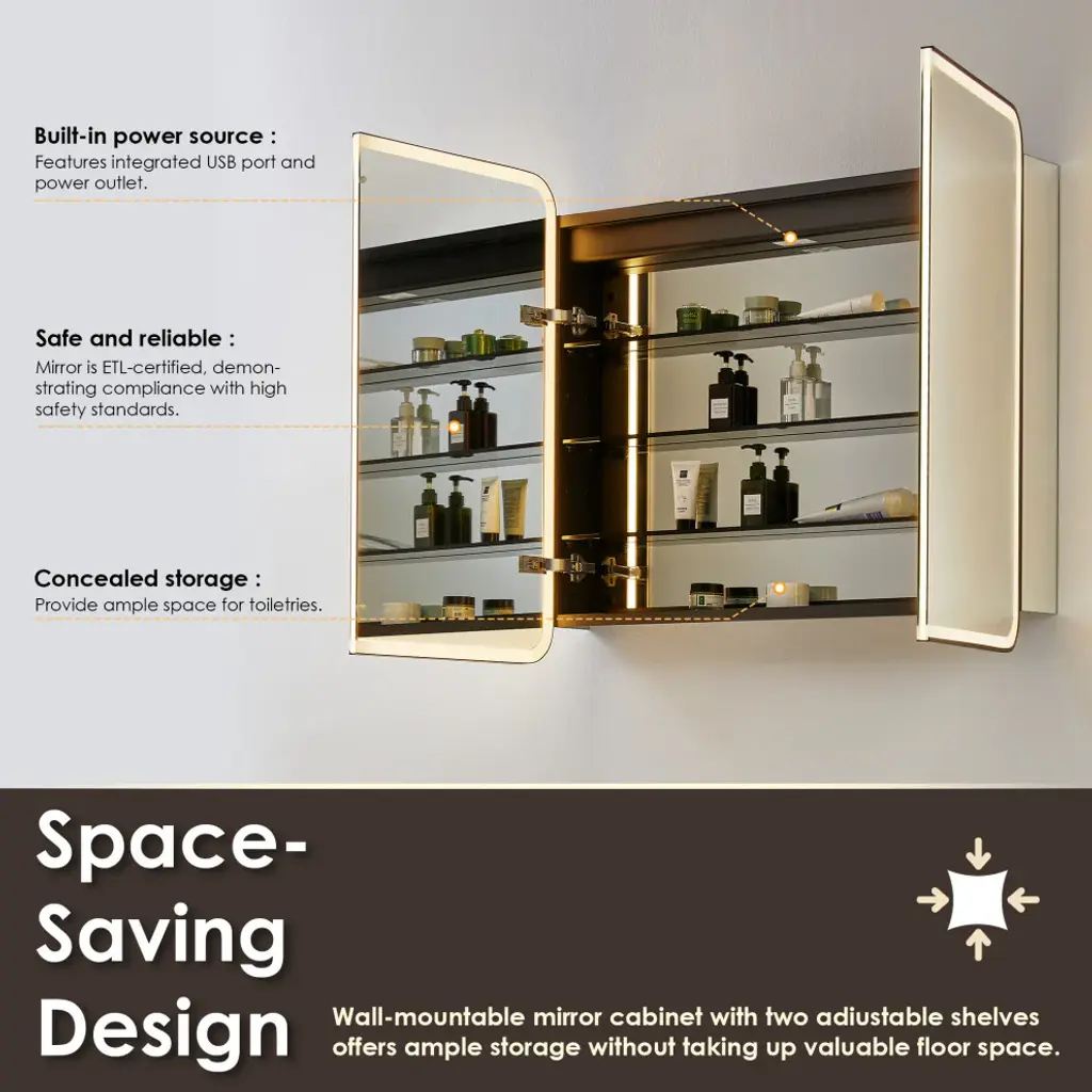 Our Ostaria LED Medicine Cabinet is the height of modern elegance, engineered with an emphasis on safety and sophistication. Adjustable LED lights with touch-sensor technology offer soft, atmospheric illumination, while the convenient memory feature recalls your preferred settings. And with integrated power outlets, your styling tools will be in easy reach. Behind the soft-closing door lies a spacious cabinet with three height-adjustable shelves, providing customizable storage to keep your essentials organized and at your fingertips.FeaturesHigh-quality: 5mm copper-free mirror with safety film prevents glass shards from scattering in the rare event of breakage.Soft LED illumination: Innovative and integrated lighting design of the door panels, providing seamless and glare-free lighting into a better intensity and softness.Adjustable: Touch sensor allows for adjustable color temperature and brightness to suit your mood. oTap lightly for 3 color temperature changes (6000k/cold, 4000k/natural, 3000k/warm).oLong-press for brightness adjustment (10%-100%).Stylish: Double-sided LED mirror door features a Matte Black frame and rounded corners. Durable: Aluminum frame with anodized coating provides a decorative, corrosion-resistant finish.Concealed storage: Soft-closing door offers smooth opening and closing, while 3 height-adjustable, black tempered glass shelves (8mm thickness) provide ample space for toiletries.Built-in power source: Features integrated USB port and power outlet.Memory function: Retains same lighting settings as before a power failure.Waterproof: Tidy, fully enclosed alloy-coated back sheet is rated IP44 waterproof.Easy installation: Mirror is designed to be seamlessly surface-mounted or recess-mounted, and supports wall switch controlling.Safe and reliable: Mirror is ETL-certified, demonstrating compliance with high safety standards.Easy to clean: Use a soft, non-abrasive, colorless liquid cleanser to easily remove dirt and grime.Versatile: Fits a variety of decor styles (modern, glam, industrial, farmhouse, rustic).Multiple sizes: Choose from 3 different sizes to suit your unique space. Limited 1-year warranty: Purchase with complete peace of mind.