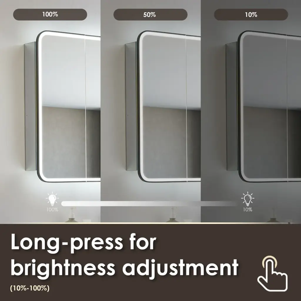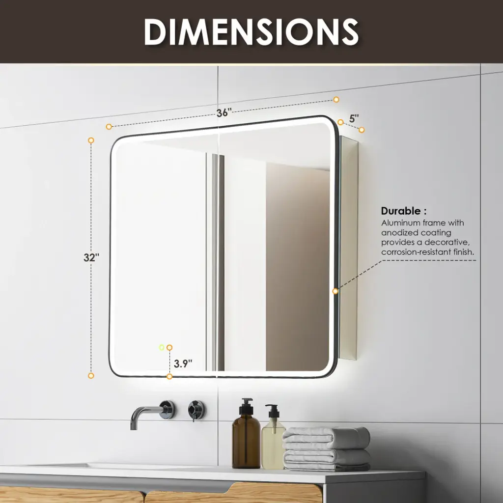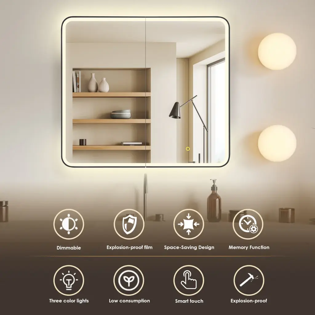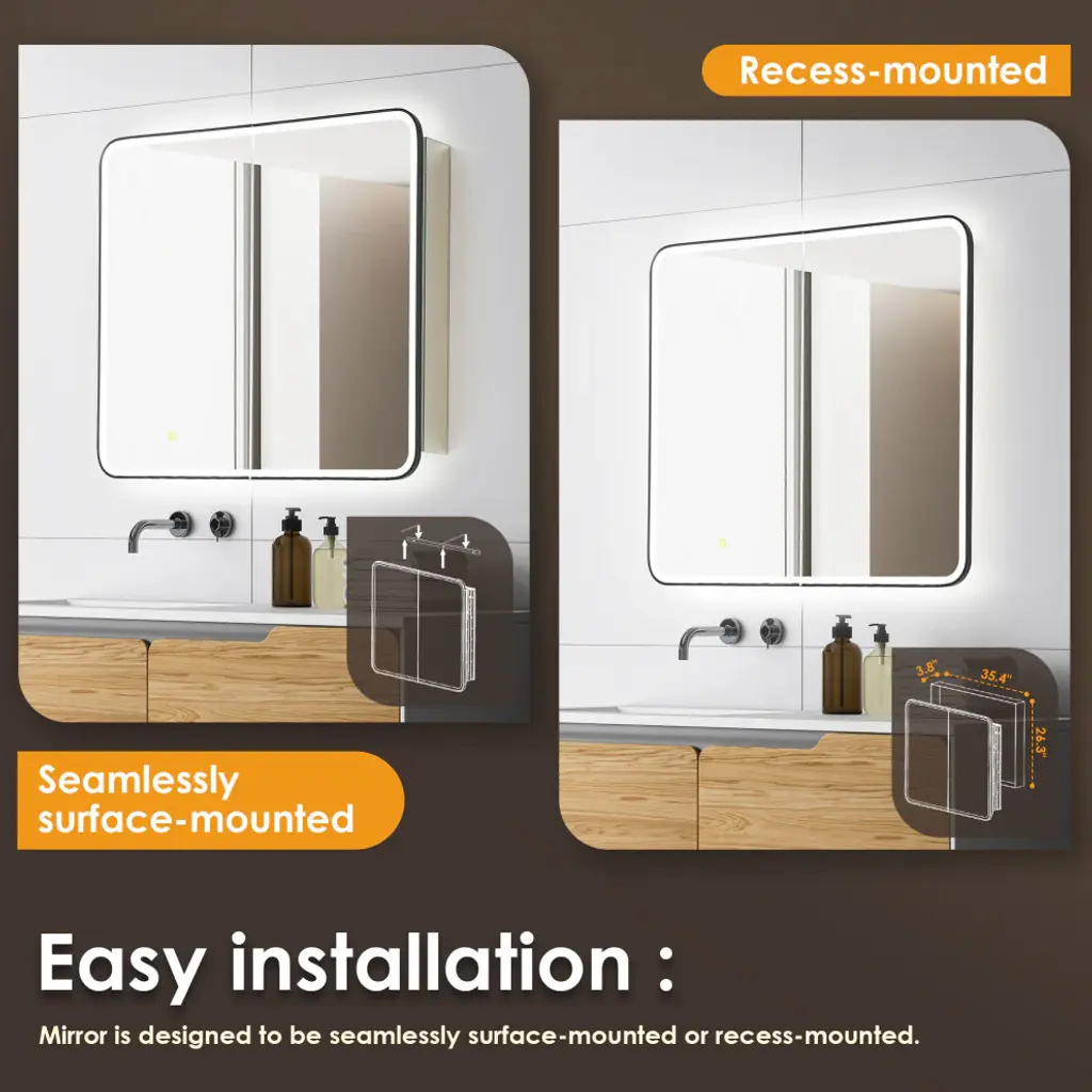 Our Ostaria LED Medicine Cabinet is the height of modern elegance, engineered with an emphasis on safety and sophistication. Adjustable LED lights with touch-sensor technology offer soft, atmospheric illumination, while the convenient memory feature recalls your preferred settings. And with integrated power outlets, your styling tools will be in easy reach. Behind the soft-closing door lies a spacious cabinet with three height-adjustable shelves, providing customizable storage to keep your essentials organized and at your fingertips.FeaturesHigh-quality: 5mm copper-free mirror with safety film prevents glass shards from scattering in the rare event of breakage.Soft LED illumination: Innovative and integrated lighting design of the door panels, providing seamless and glare-free lighting into a better intensity and softness.Adjustable: Touch sensor allows for adjustable color temperature and brightness to suit your mood. oTap lightly for 3 color temperature changes (6000k/cold, 4000k/natural, 3000k/warm).oLong-press for brightness adjustment (10%-100%).Stylish: Double-sided LED mirror door features a Matte Black frame and rounded corners. Durable: Aluminum frame with anodized coating provides a decorative, corrosion-resistant finish.Concealed storage: Soft-closing door offers smooth opening and closing, while 3 height-adjustable, black tempered glass shelves (8mm thickness) provide ample space for toiletries.Built-in power source: Features integrated USB port and power outlet.Memory function: Retains same lighting settings as before a power failure.Waterproof: Tidy, fully enclosed alloy-coated back sheet is rated IP44 waterproof.Easy installation: Mirror is designed to be seamlessly surface-mounted or recess-mounted, and supports wall switch controlling.Safe and reliable: Mirror is ETL-certified, demonstrating compliance with high safety standards.Easy to clean: Use a soft, non-abrasive, colorless liquid cleanser to easily remove dirt and grime.Versatile: Fits a variety of decor styles (modern, glam, industrial, farmhouse, rustic).Multiple sizes: Choose from 3 different sizes to suit your unique space. Limited 1-year warranty: Purchase with complete peace of mind.