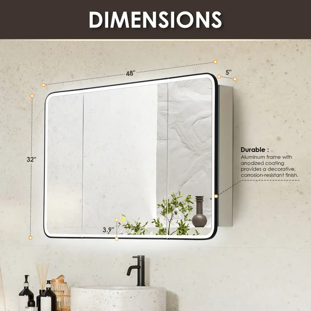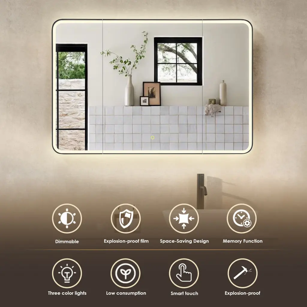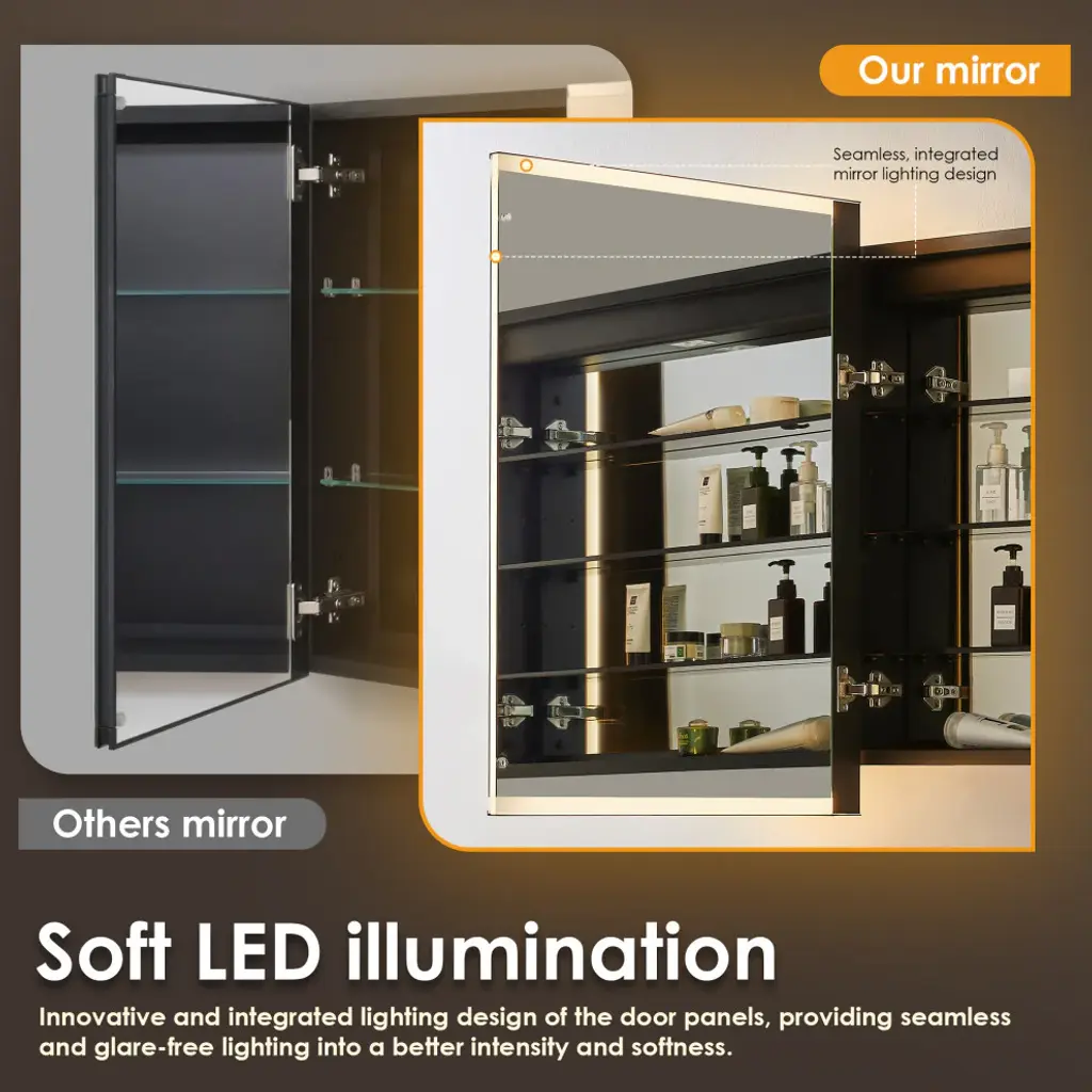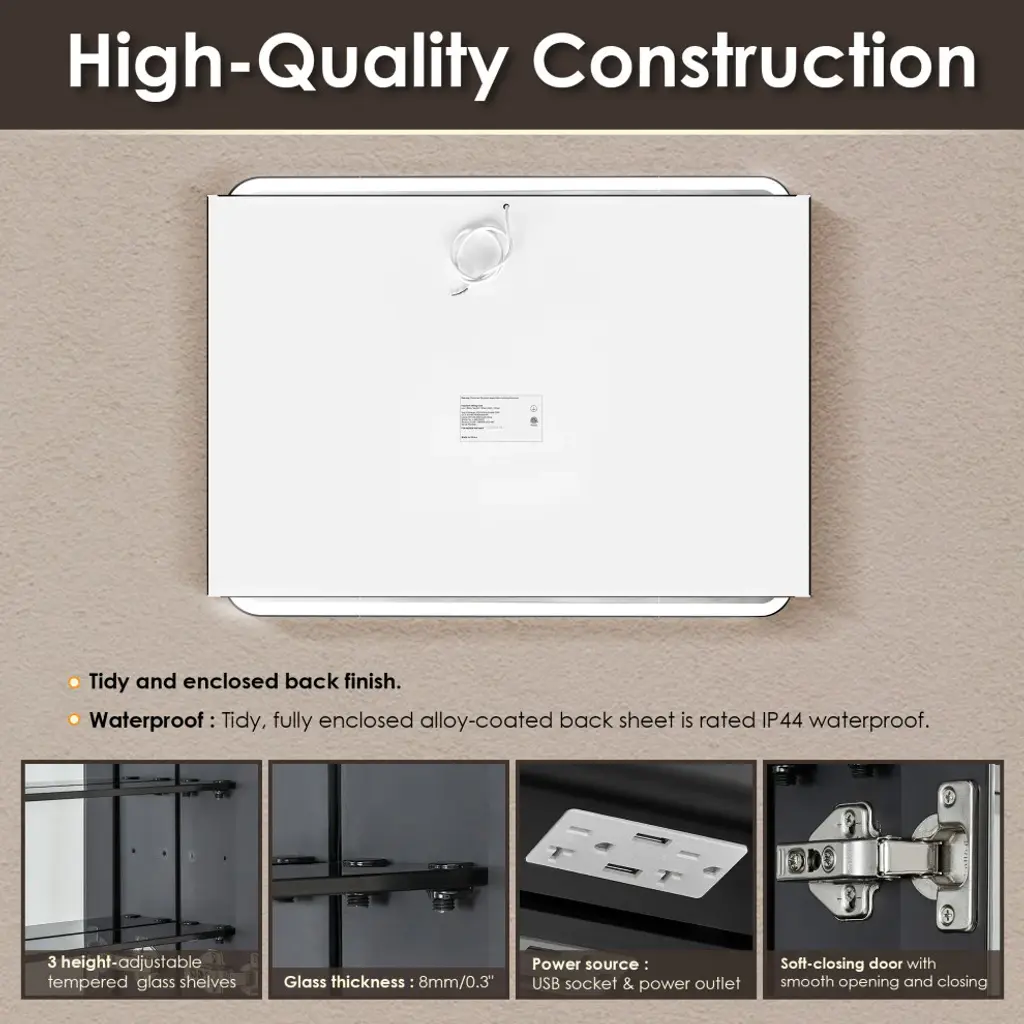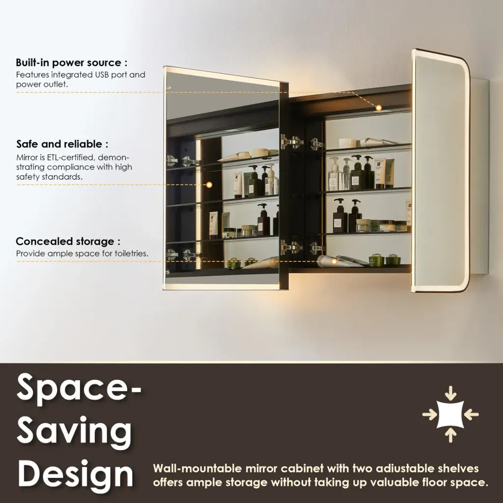 Our Ostaria LED Medicine Cabinet is the height of modern elegance, engineered with an emphasis on safety and sophistication. Adjustable LED lights with touch-sensor technology offer soft, atmospheric illumination, while the convenient memory feature recalls your preferred settings. And with integrated power outlets, your styling tools will be in easy reach. Behind the soft-closing door lies a spacious cabinet with three height-adjustable shelves, providing customizable storage to keep your essentials organized and at your fingertips.FeaturesHigh-quality: 5mm copper-free mirror with safety film prevents glass shards from scattering in the rare event of breakage.Soft LED illumination: Innovative and integrated lighting design of the door panels, providing seamless and glare-free lighting into a better intensity and softness.Adjustable: Touch sensor allows for adjustable color temperature and brightness to suit your mood. oTap lightly for 3 color temperature changes (6000k/cold, 4000k/natural, 3000k/warm).oLong-press for brightness adjustment (10%-100%).Stylish: Double-sided LED mirror door features a Matte Black frame and rounded corners. Durable: Aluminum frame with anodized coating provides a decorative, corrosion-resistant finish.Concealed storage: Soft-closing door offers smooth opening and closing, while 3 height-adjustable, black tempered glass shelves (8mm thickness) provide ample space for toiletries.Built-in power source: Features integrated USB port and power outlet.Memory function: Retains same lighting settings as before a power failure.Waterproof: Tidy, fully enclosed alloy-coated back sheet is rated IP44 waterproof.Easy installation: Mirror is designed to be seamlessly surface-mounted or recess-mounted, and supports wall switch controlling.Safe and reliable: Mirror is ETL-certified, demonstrating compliance with high safety standards.Easy to clean: Use a soft, non-abrasive, colorless liquid cleanser to easily remove dirt and grime.Versatile: Fits a variety of decor styles (modern, glam, industrial, farmhouse, rustic).Multiple sizes: Choose from 3 different sizes to suit your unique space. Limited 1-year warranty: Purchase with complete peace of mind.