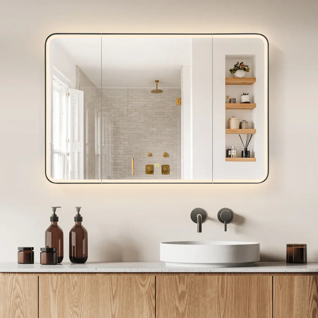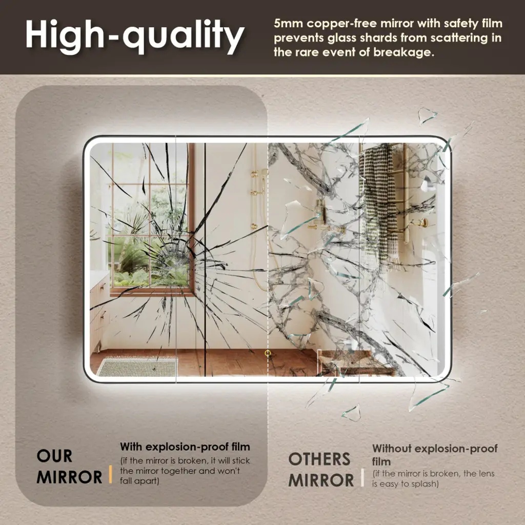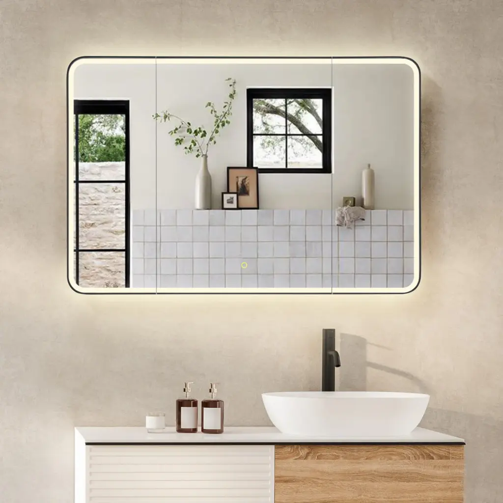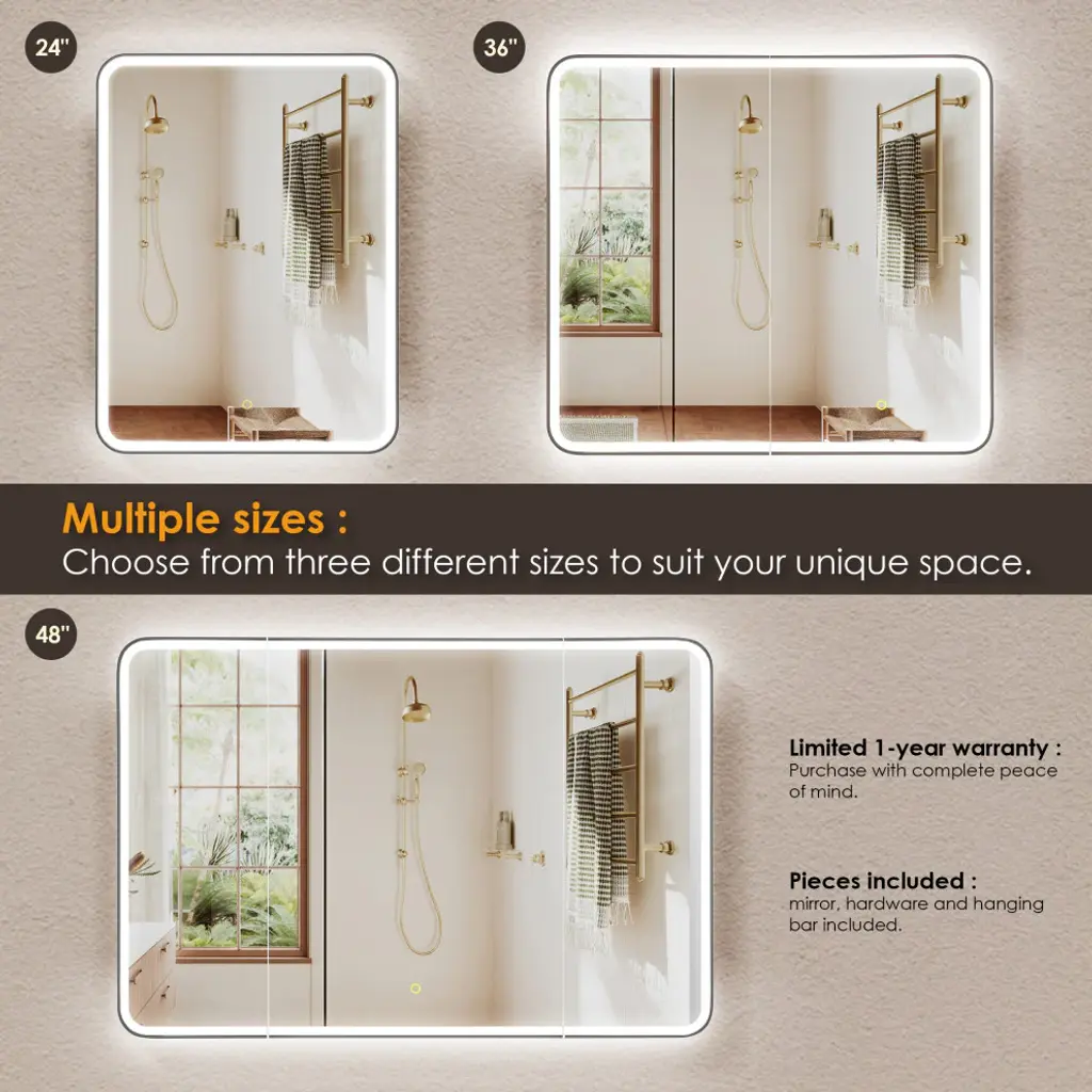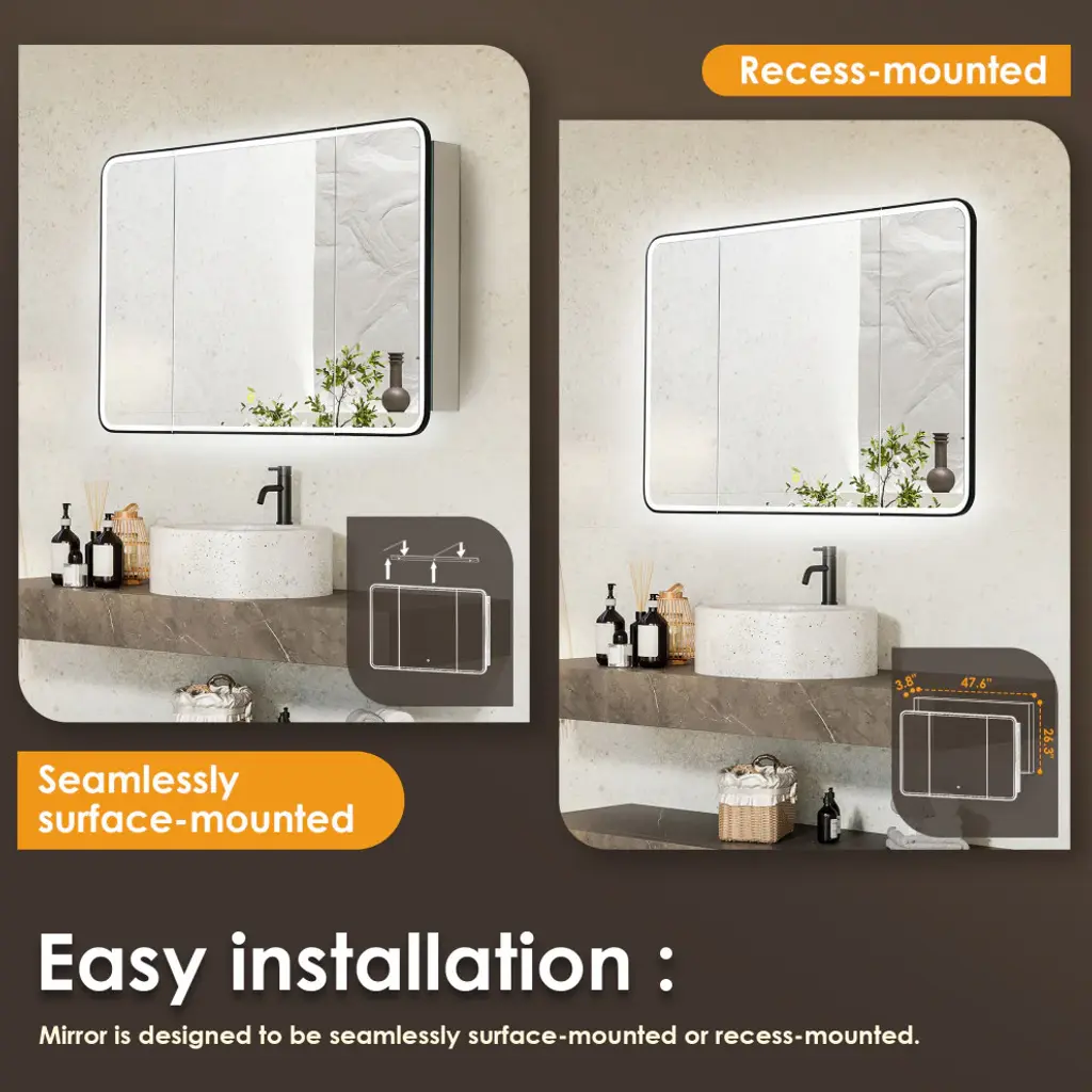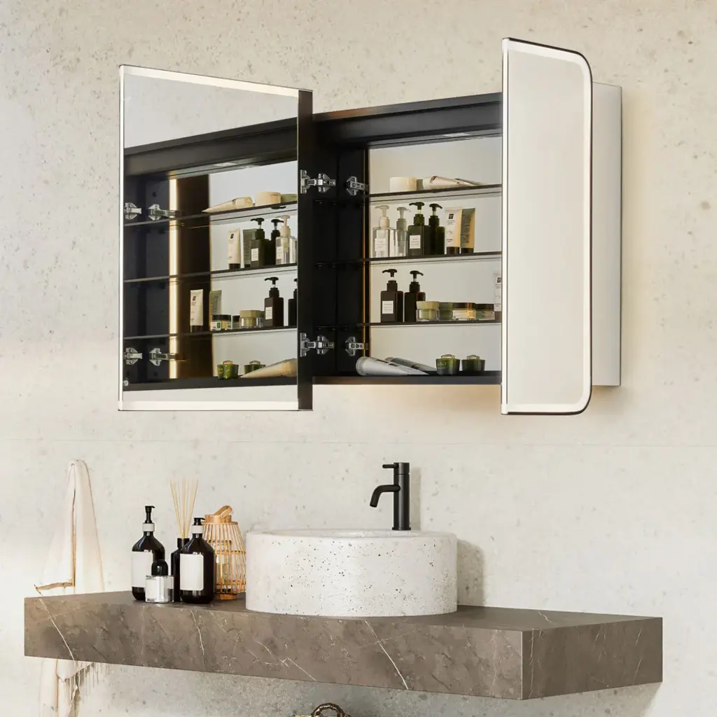 Our Ostaria LED Medicine Cabinet is the height of modern elegance, engineered with an emphasis on safety and sophistication. Adjustable LED lights with touch-sensor technology offer soft, atmospheric illumination, while the convenient memory feature recalls your preferred settings. And with integrated power outlets, your styling tools will be in easy reach. Behind the soft-closing door lies a spacious cabinet with three height-adjustable shelves, providing customizable storage to keep your essentials organized and at your fingertips.FeaturesHigh-quality: 5mm copper-free mirror with safety film prevents glass shards from scattering in the rare event of breakage.Soft LED illumination: Innovative and integrated lighting design of the door panels, providing seamless and glare-free lighting into a better intensity and softness.Adjustable: Touch sensor allows for adjustable color temperature and brightness to suit your mood. oTap lightly for 3 color temperature changes (6000k/cold, 4000k/natural, 3000k/warm).oLong-press for brightness adjustment (10%-100%).Stylish: Double-sided LED mirror door features a Matte Black frame and rounded corners. Durable: Aluminum frame with anodized coating provides a decorative, corrosion-resistant finish.Concealed storage: Soft-closing door offers smooth opening and closing, while 3 height-adjustable, black tempered glass shelves (8mm thickness) provide ample space for toiletries.Built-in power source: Features integrated USB port and power outlet.Memory function: Retains same lighting settings as before a power failure.Waterproof: Tidy, fully enclosed alloy-coated back sheet is rated IP44 waterproof.Easy installation: Mirror is designed to be seamlessly surface-mounted or recess-mounted, and supports wall switch controlling.Safe and reliable: Mirror is ETL-certified, demonstrating compliance with high safety standards.Easy to clean: Use a soft, non-abrasive, colorless liquid cleanser to easily remove dirt and grime.Versatile: Fits a variety of decor styles (modern, glam, industrial, farmhouse, rustic).Multiple sizes: Choose from 3 different sizes to suit your unique space. Limited 1-year warranty: Purchase with complete peace of mind.