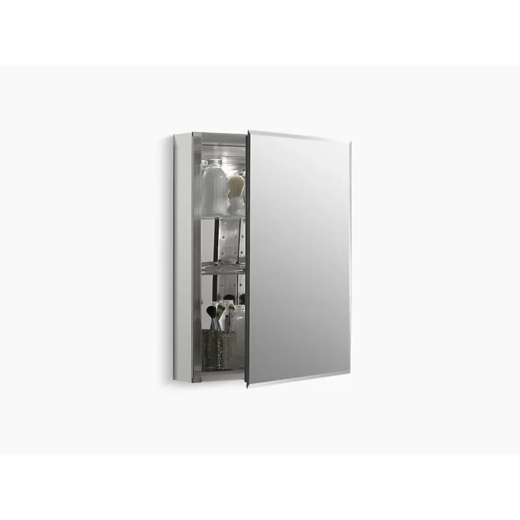 Showcasing elegant bronze detailing on its frame, this wall-mounted medicine cabinet features a reversible door that can be installed with a left- or right-hand hinge. Mirrors are positioned on the front and back of the door as well as the interior back of the cabinet. 2 Adjustable tempered-glass shelves hold your toiletries and bath items. Durable aluminum construction makes this cabinet rust- and rot-resistant.