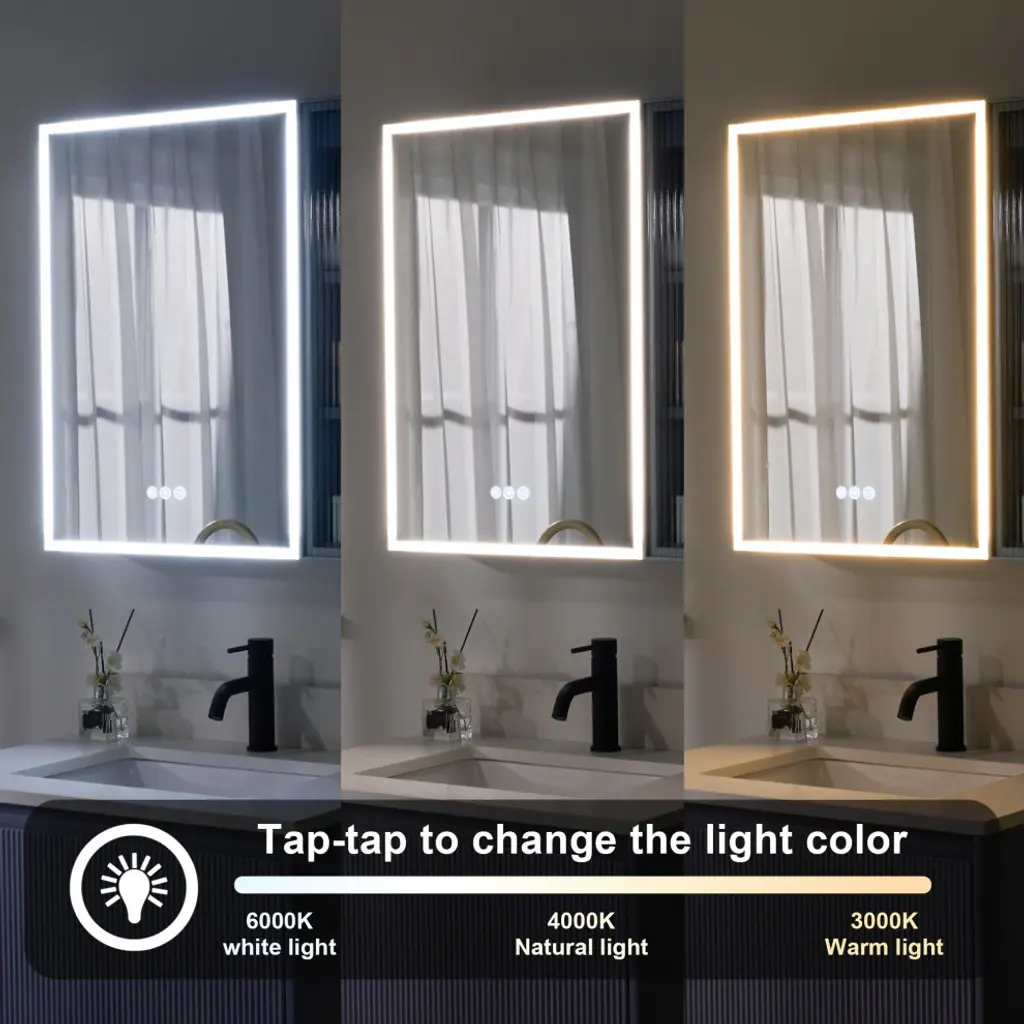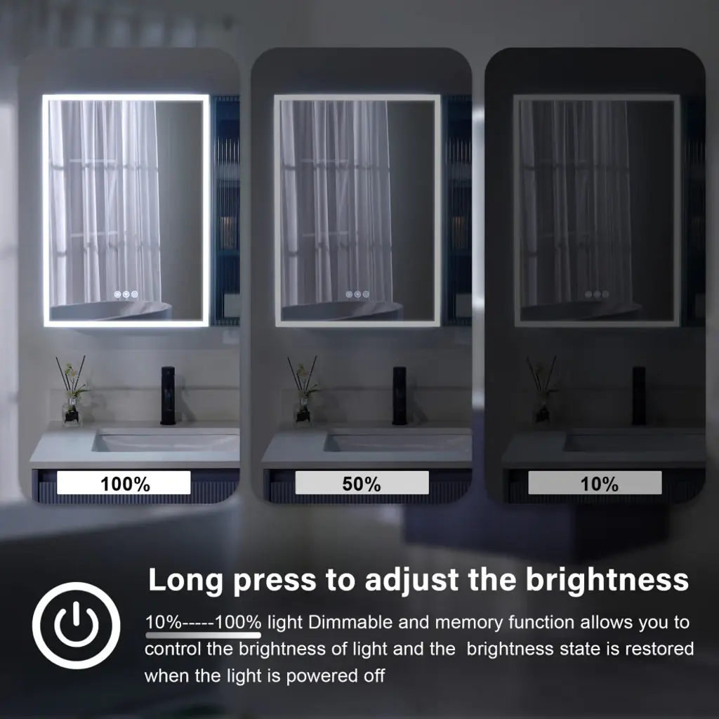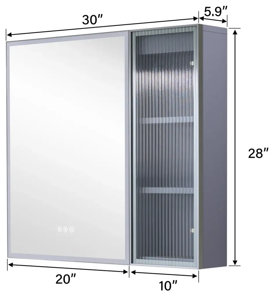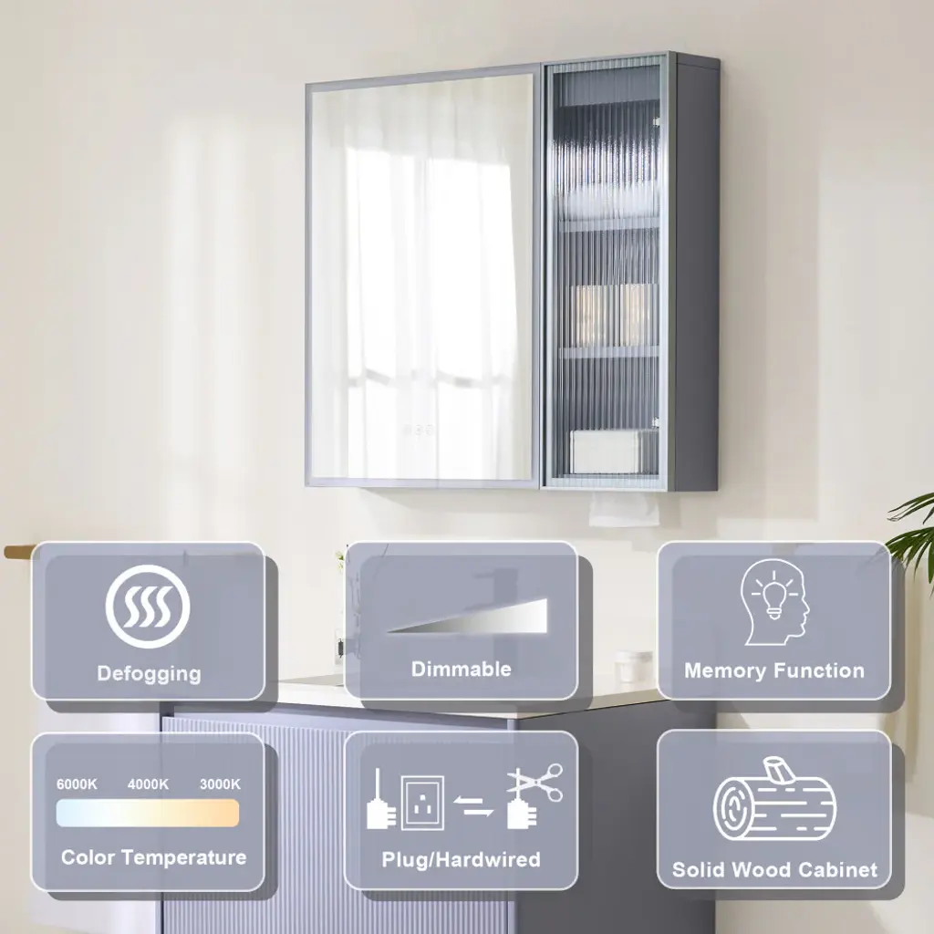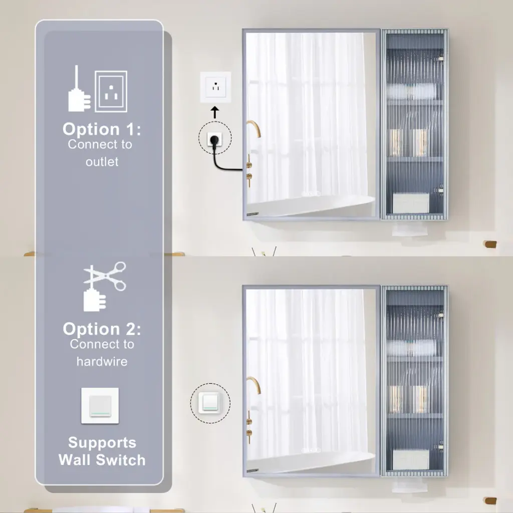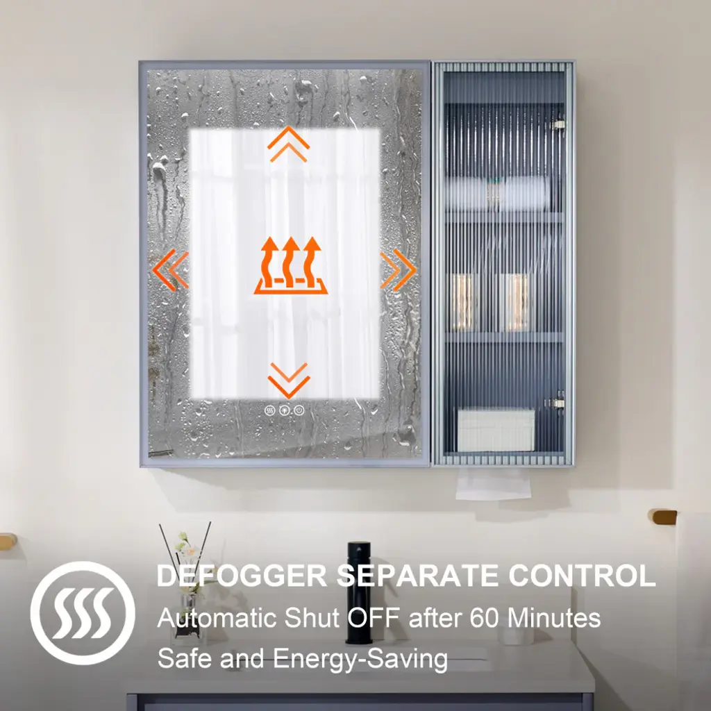Our LED lighted medicine cabinet comes with 3 solid wood shelves, gives you the perfect custom storage solution to neatly tuck away all your bathroom essentials. Effortlessly adjust lighting using touch controls for on/off, defogging, and color/brightness settings, provide you and your family with a better skin care or make up experience. Featured with premium LED strip light, providing optimally bright bathroom vanity lighting. Tempred Fluted glass ensures durability and safety. DTC Door Hinges offer noiseless, elegant door closure. Wall-mounted Z bar installation kit make medicine cabinet more soild to hang up. It is the best idea for your bathroom!1. Light Temperature and Brightness Adjustable: Light temperature from 3000K-6000K, brightness from 10%-100%. Provide you an ideal light.2. Better Defogging: Built-in defogger provides better defogger performance, defog faster.3. Well-made: Tempred Fluted glass ensures durability and safety; Electroplated stainless steel door frame for extra durability, adds a timeless elegance, and solid wood blend aesthetics.4. Silent Closure: DTC Door Hinges offer noiseless, elegant door closure. It will not disturb your family.5. Eco-Friendly Craftsmanship: Sustainably sourced wood with eco-paint promotes eco-friendly living.6. Large Storage Space: 2 shelves with mirrored door and 3 shelves with aluminum alloy frame glass door, provide extra large storage space and make your stuffs be organized.7. Effortless Setup: The included wall-mounted Z bar installation kit make installtion easier, and the medicine cabinet will be more solid to hang up.8. Two-year limited Warranty.
