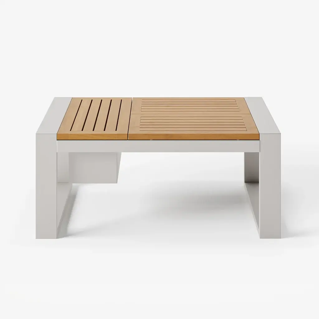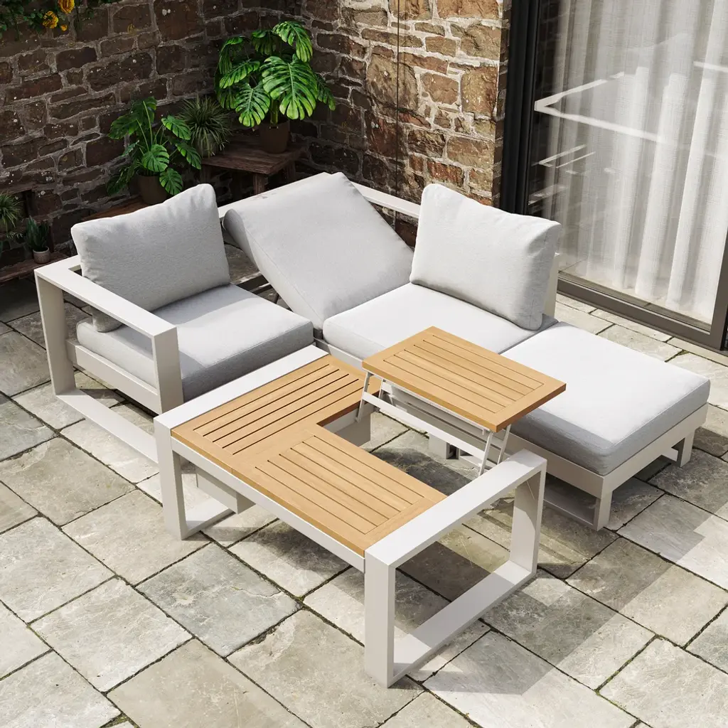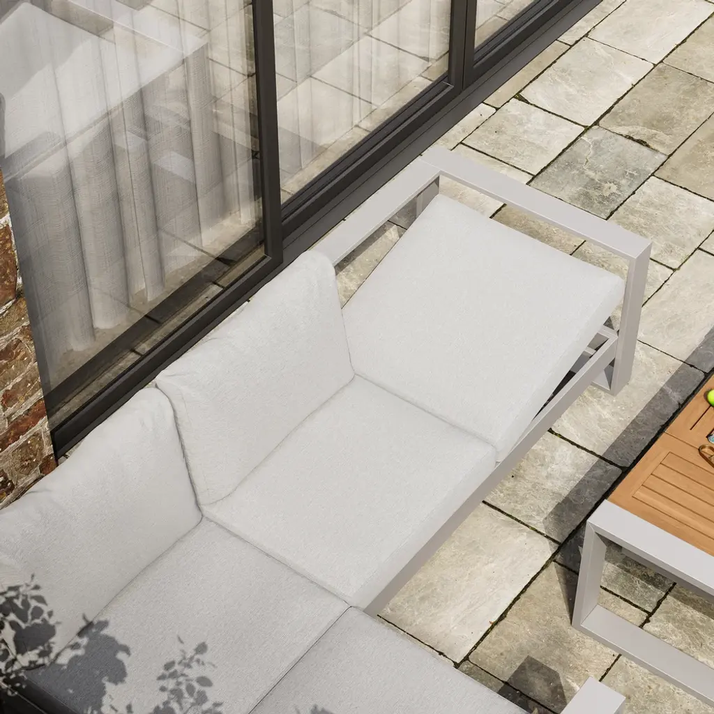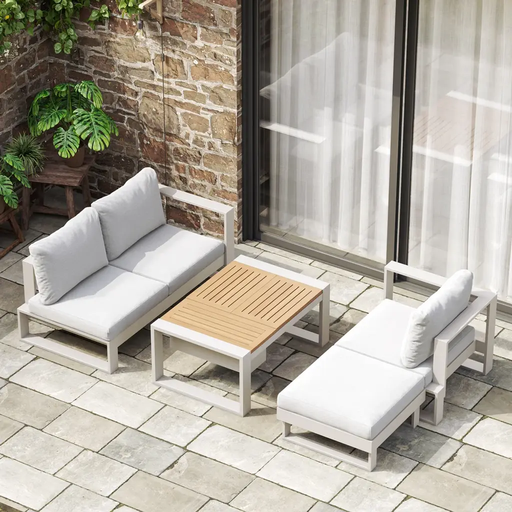White aluminum meets warm acacia wood in a modular design for flexible outdoor comfort. Enjoy relaxed hours in the yard full of peace and joy. All materials are weatherproofed, so you need less maintenance and can spend more time outdoors.