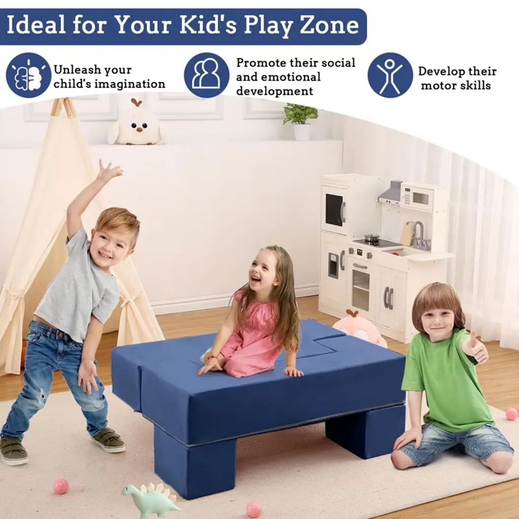 This kids' modular sofa features ultra-soft, durable microvelvet fabric and supportive high-density foam that retains its shape. Perfectly sized for toddlers ages 1-4, it includes side pockets for books and has a removable, machine-washable cover for easy cleaning. Lightweight and screw-free for safety, it arrives vacuum-packed and expands to full size within 2-3 days.