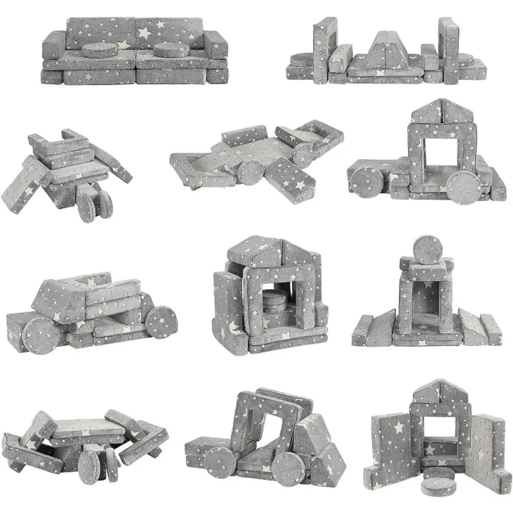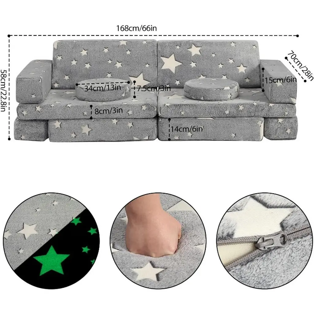 The Acekool 12-Piece Modular Kids Couch is built for creative play, comfort, and restful sleep. This convertible couch features 12 soft pieces that transform into forts, beds, tunnels, and more, providing fun for both boys and girls. Glow-in-the-dark star accents light up the room, encouraging imaginative adventures after the lights go out. Its modern grey color fits easily into any space, while the cushions are supportive and gentle for any activity. Allow up to 5 days after unboxing for each piece to fully expand and regain its shape, making it ready for interactive play, cozy reading, or nap time. This versatile set is a playful and practical addition to bedrooms or playrooms.