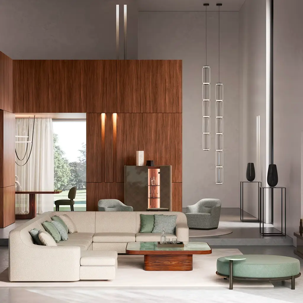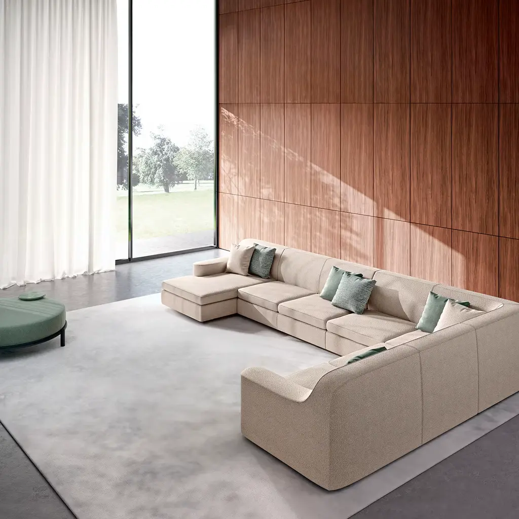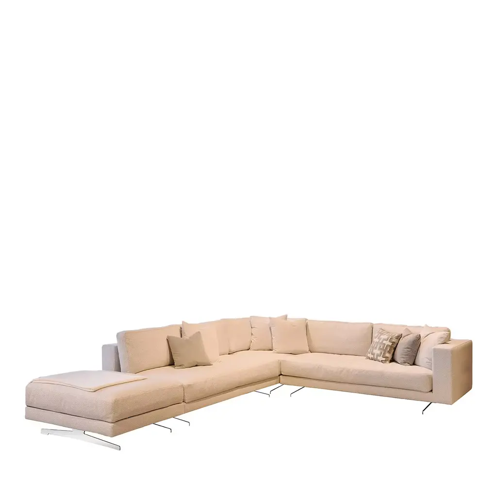 Simple and stylish, this modular sofa is characterized by an L-shaped silhouette providing for utmost comfort and relaxation. Deftly made, it features a wooden frame padded with multi-density polyurethane foam, and soft seat cushions also padded with polyurethane foam, covered with a polyester wadding and a fabric upholstery. Decorative pillows can be requested, as well as fabric and leather customizations. Please contact the Concierge for details.