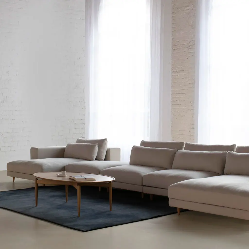The Atelier Modular Sofa is an exercise in simplicity and casual elegance. The sofa is all about upholstery and refined sartorial detailing, high quality linen with a soft and generous touch, - inviting to relax and lounge. The Atelier Sofa has an added depth for lounging in a private residence and endless combinations of the 5 modules enables it to adapt to changing needs and conditions. The quiet, serene aesthetic makes it very easy to combine with other furniture of more complex nature and different materials. The deep armrest acts as a soft side table for a book, a pair of glasses or a telephone. Even though The Atelier Sofa has a clean and sophisticated look, - it is meant to be very functional and easy to maintain, - it has removable covers, which can be dry cleaned if needed. The soft and plump cushions can be moved around to enhance malleable comfort sitting or lounging.