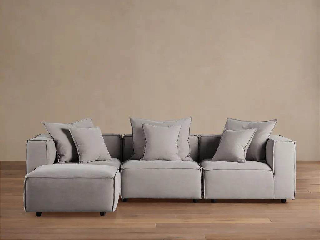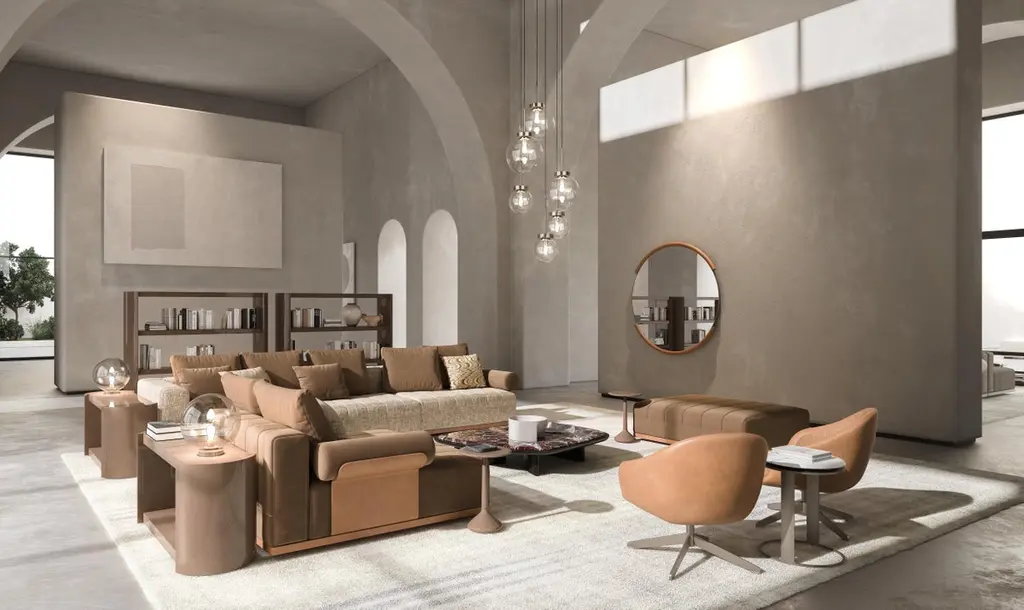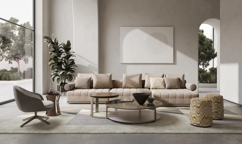 This is a modular sofa that can be configured using various modules to suit different spaces and needs. Instead of traditional armrests, it features cylindrical bolster cushions that enhance both comfort and aesthetics. The upholstery is available in either fabric or leather, offering versatility in texture and style. The design is modern and sophisticated, making it a perfect fit for contemporary interiors.
