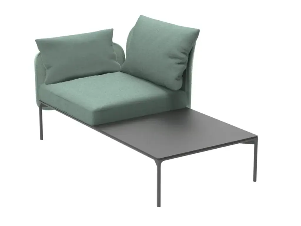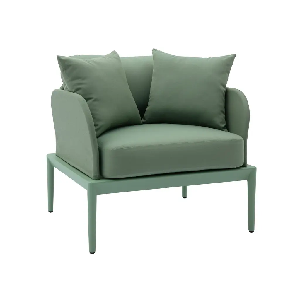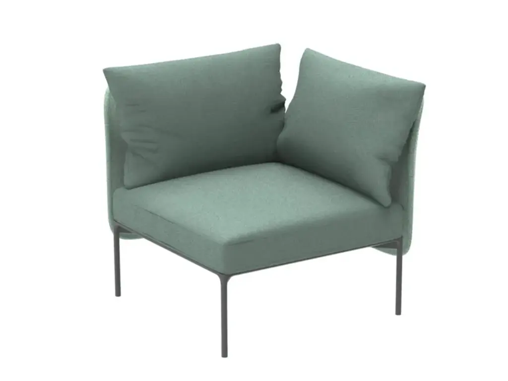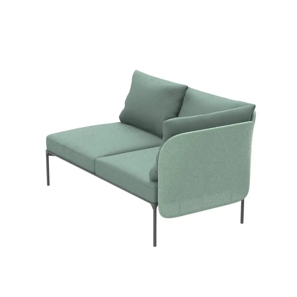 Bloom is a two seater sofa with aluminium frame and covered fabric. The collection includes poufs, sofas, small sofas and different armchairs, designed to create a seating system.