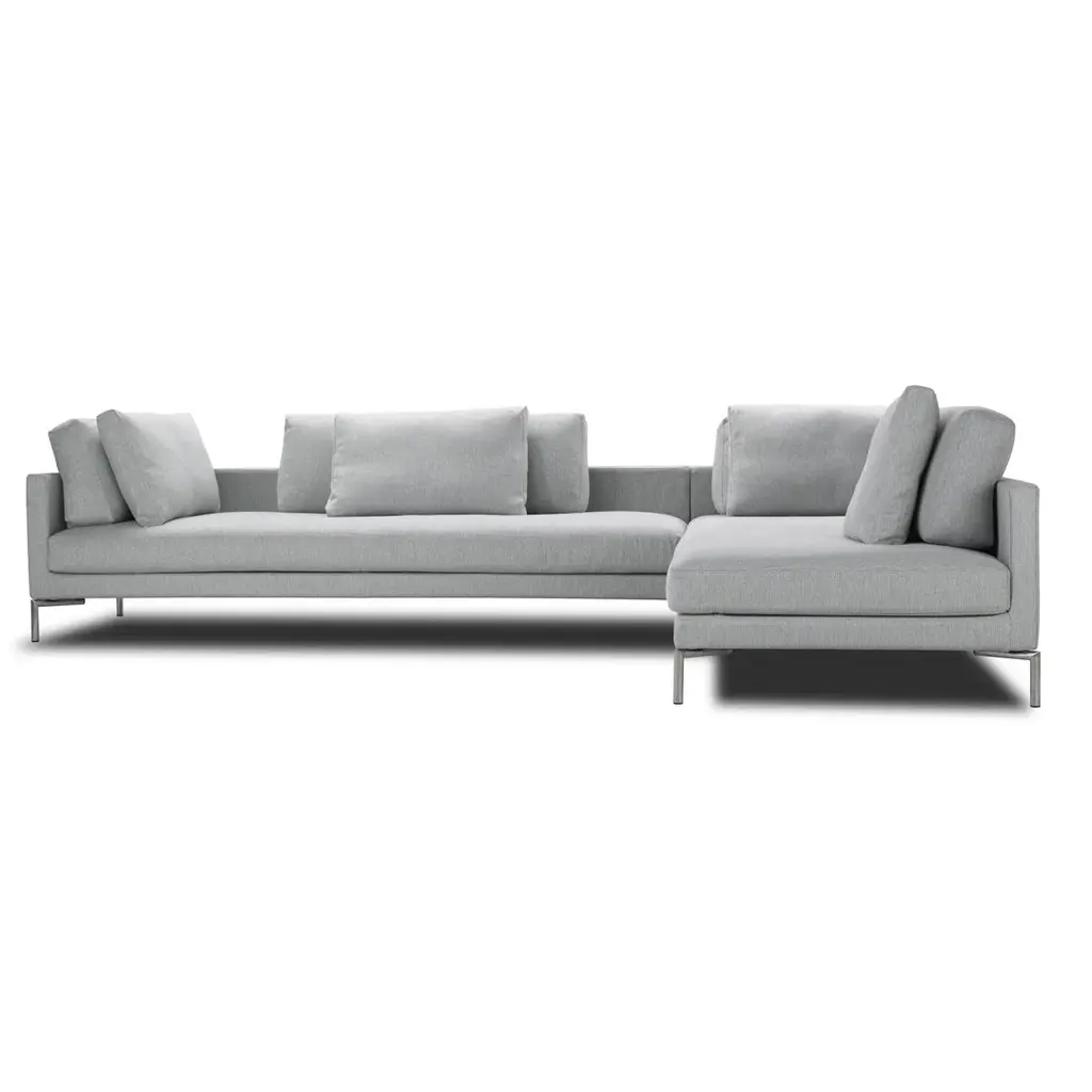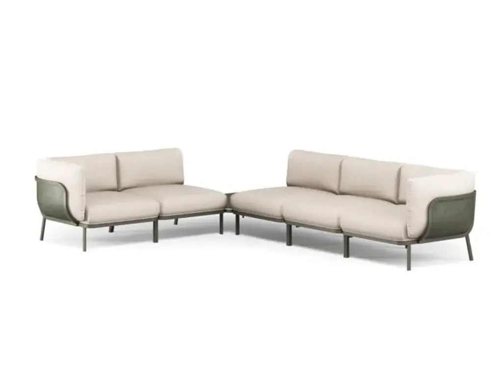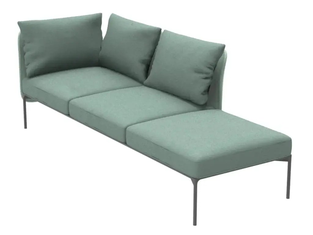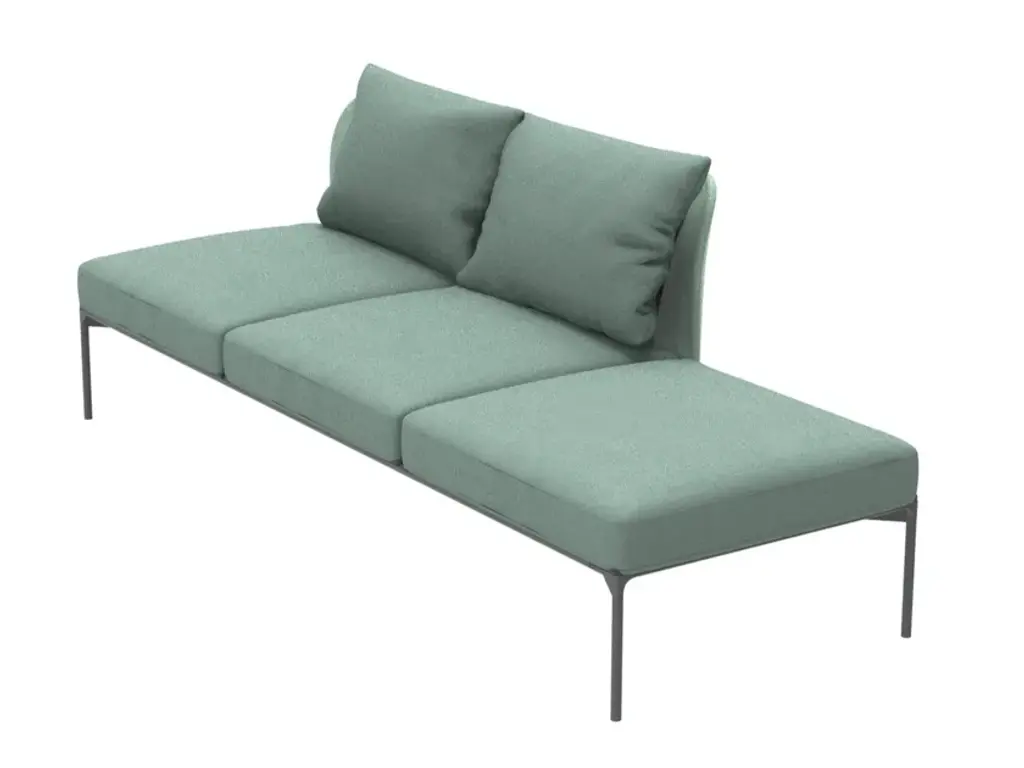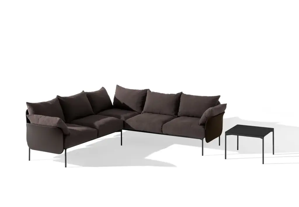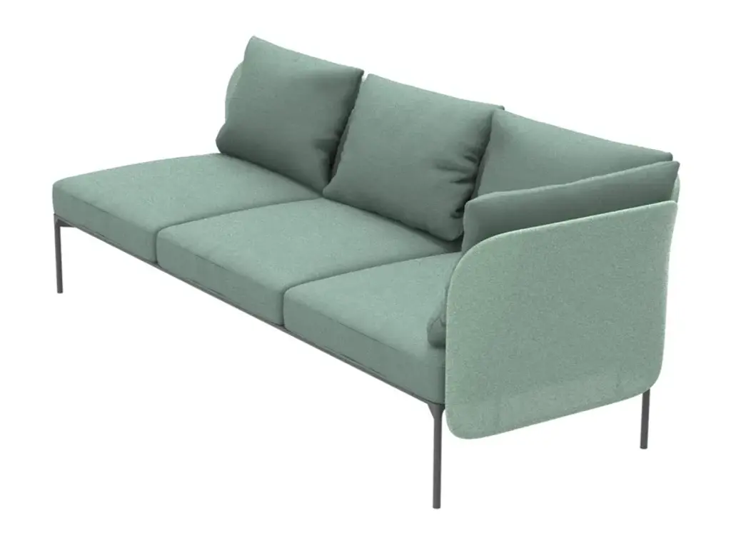 Bloom is a three seater sofa with aluminium frame and fabric seat. The collection includes poufs, sofas, small sofas and different armchairs, designed to create a seating system.