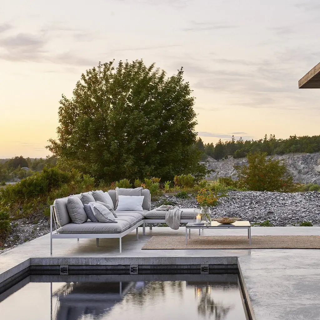 Bonan is a sleepy fishing village on the Swedish coast, a couple of hours' drive north of Stockholm. It's just a few boats and a lighthouse, really. On an amazing nearby seaside lot, two of Skargaarden's founders build what looks like a modern incarceration of a mid-century Case Study House. Then they needed a sofa: one that would capture the spirit of the house, the village and the Baltic coast; as well as art, love and preferably life in general. Oh, and you should be able to leave it by the pool all year, without worrying about it or maintaining it. Actually, the last point is something we've heard more than once from hotel and restaurant owners in warmer parts of the world as well. So why not make a sofa for Bonan that could be used anywhere? But in the end, we weren't happy just making a sofa. We created a modular sofa system that can be assembled in many different combinations. Kind of clever - even if we say so ourselves.