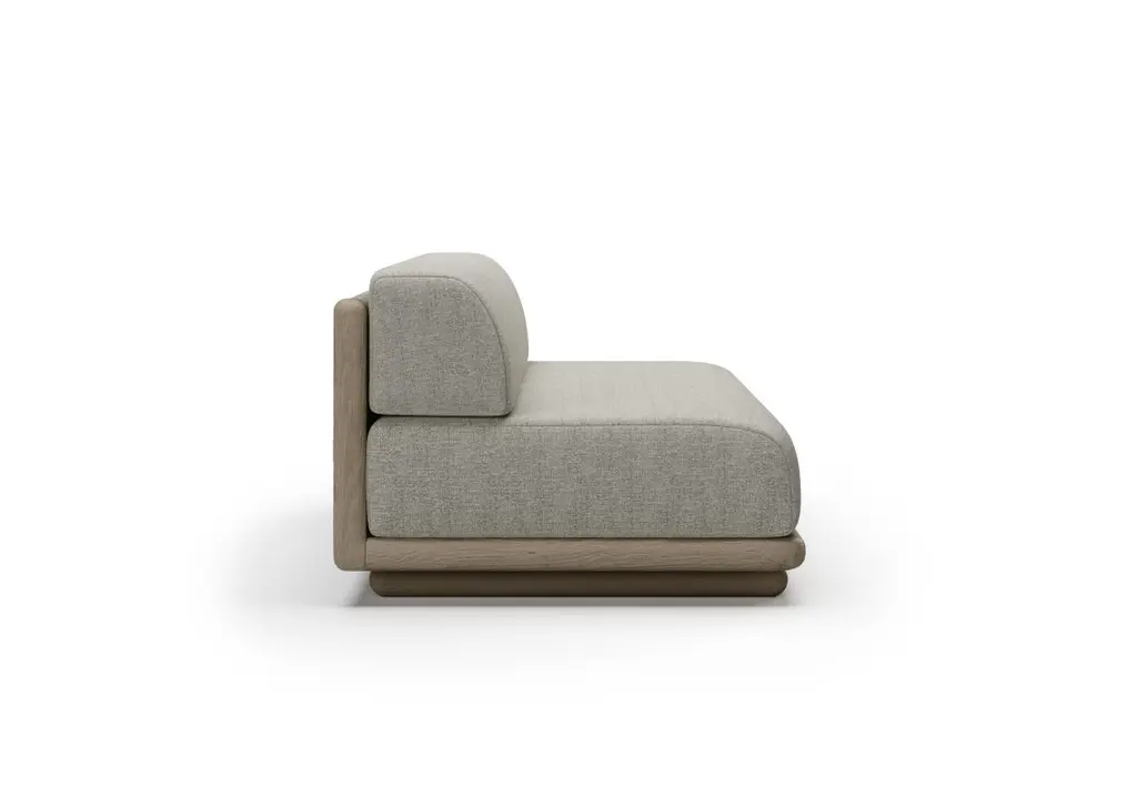 Caleo-Ash Teak Wood, Rope And Ethereal Fabric Two-Seater Modular Sofa by SNOCDimensions: D 100 x W 181 x H 65 cm. SH: 42 cm.Materials: Teak wood, rope, and Ethereal fabric. The Caleo Collection embodies understated luxury, blending contemporary form with timeless materials. Designed for both outdoor settings, this modular lounge series prioritizes comfort and adaptability, offering sleek, minimalist lines that define the space while providing unmatched flexibility. Crafted with a refined Ash and Natural Teak wood frame, the collection’s modularity invites creative configurations, allowing each piece to seamlessly adapt to different environments. Upholstered in soft, durable fabrics, the seating offers a tactile warmth that contrasts beautifully with the solid structure, making it a perfect blend of softness and strength.SnocSince their foundation in 2004, SNOC’s history has been interwoven with that of international design. Each chapter written with care, each product reflecting its passion. The company understands that a real story exists behind each object and behind that story, a real person desiring something more. Their ever-developing methodology focuses on defining the core of a brand and utilizing those characteristics to help nurture its soul, aiding in forging real connections. This approach , results in their unique “work in progress” style: original, versatile solutions that in their signature blend of sound, vision and design best-suit every environment and situation, arousing a range of emotions on a daily basis as well as standing the test of time.Driven by functional research, an inclusive project and product culture, and deep care for the environment, we exist as the timeless yet present essence of outdoor furniture design elevating private and public space a like with thoughtfully presented, endlessly adaptive creations.