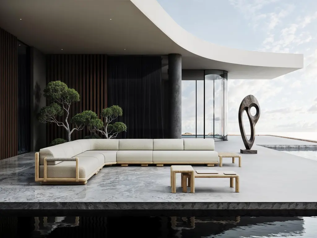 Caleo-Natural Teak, Rope And Ethereal Fabric Half Backrest Modular Sofa by SNOCDimensions: D 100 x W 181 x H 65 cm. SH: 42 cm.Materials: Teak wood, rope, and Ethereal fabric. The Caleo Collection embodies understated luxury, blending contemporary form with timeless materials. Designed for both outdoor settings, this modular lounge series prioritizes comfort and adaptability, offering sleek, minimalist lines that define the space while providing unmatched flexibility. Crafted with a refined Ash and Natural Teak wood frame, the collection’s modularity invites creative configurations, allowing each piece to seamlessly adapt to different environments. Upholstered in soft, durable fabrics, the seating offers a tactile warmth that contrasts beautifully with the solid structure, making it a perfect blend of softness and strength.SnocSince their foundation in 2004, SNOC’s history has been interwoven with that of international design. Each chapter written with care, each product reflecting its passion. The company understands that a real story exists behind each object and behind that story, a real person desiring something more. Their ever-developing methodology focuses on defining the core of a brand and utilizing those characteristics to help nurture its soul, aiding in forging real connections. This approach , results in their unique “work in progress” style: original, versatile solutions that in their signature blend of sound, vision and design best-suit every environment and situation, arousing a range of emotions on a daily basis as well as standing the test of time.Driven by functional research, an inclusive project and product culture, and deep care for the environment, we exist as the timeless yet present essence of outdoor furniture design elevating private and public space a like with thoughtfully presented, endlessly adaptive creations.