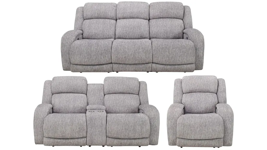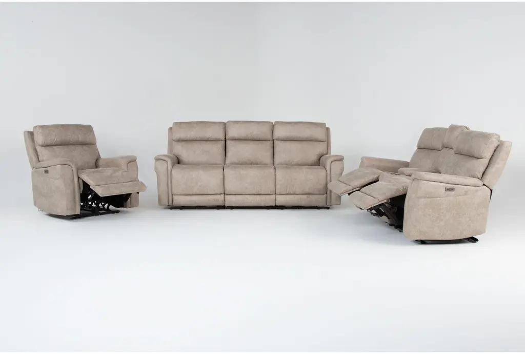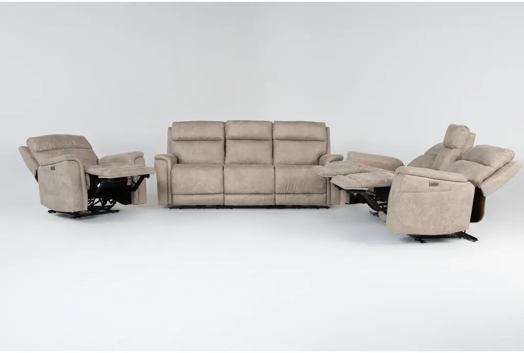 The Caspian Beige 202" 7 Piece Power Reclining Modular Living Room Set offers ultimate comfort and functionality for your living room. Upholstered in soft marble fabric, this set includes a sofa console, loveseat, and recliner. Designed for casual living, the modular pieces provide versatile seating arrangements.