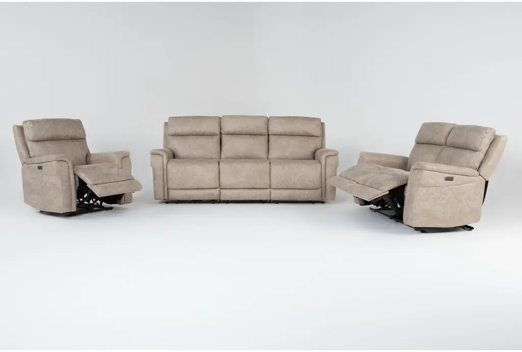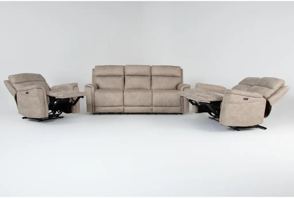 Experience unparalleled comfort and style with the Caspian Natural Beige 189" 6 Piece Power Reclining Modular Living Room Set. This set includes a sofa, loveseat, and recliner, all upholstered in soft fabric for a soothing and inviting feel. The power reclining feature and built-in USB ports make it perfect for modern living.