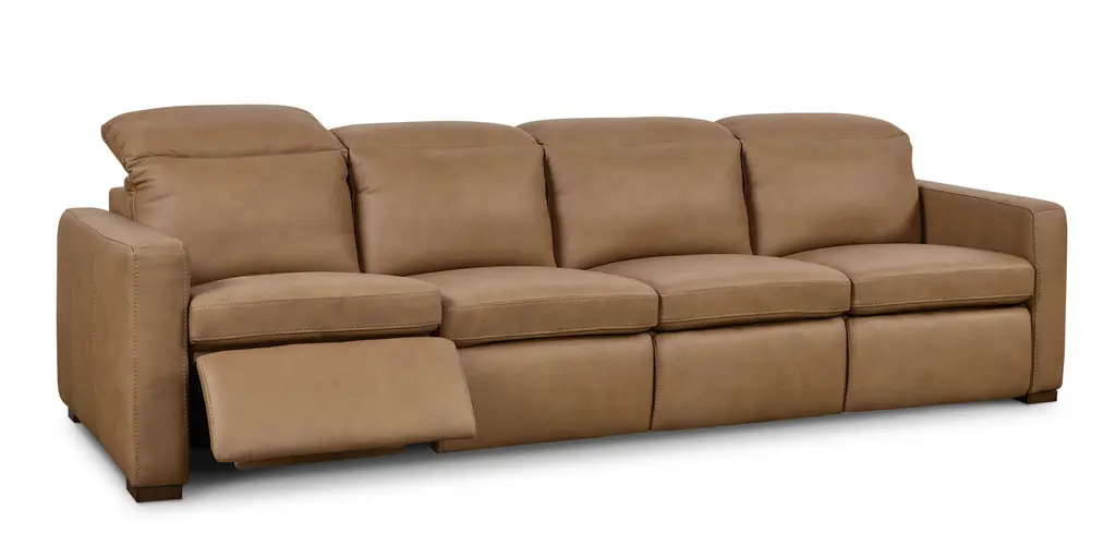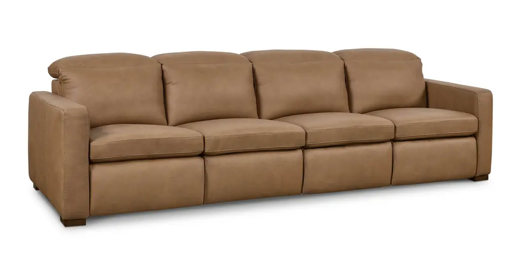The modular design of the Caswell Collection delivers an expanded, 4-seat option - the Caswell Leather Power Reclining Modular Sofa. Perfect for movie night or game day in your large gathering space, the Caswell's modern, streamlined design offers plush reclining comfort in a uniquely refined silhouette. The headrests that all elevate for reclining will fold to a flat position when not in use, allowing for a wide-open view across your room. Yet, when the wall-hugging, reclining mechanism is engaged, your relaxation can go all the way to Zero Gravity. Leather, in two color options, lines the full interior of the sofa, while the sofa can be viewed from all sides thanks to the vinyl match exterior back. If you prefer cordless power, visit a Bassett store for the battery pack option.