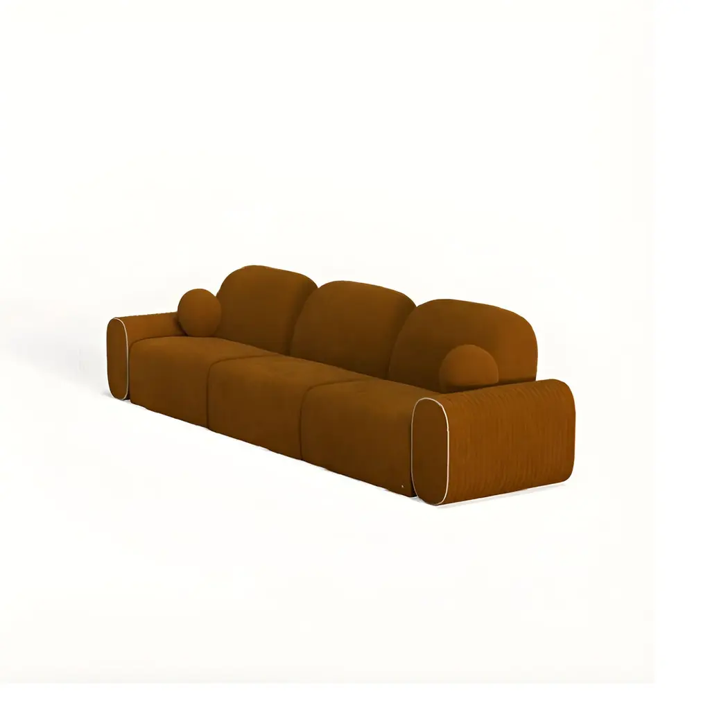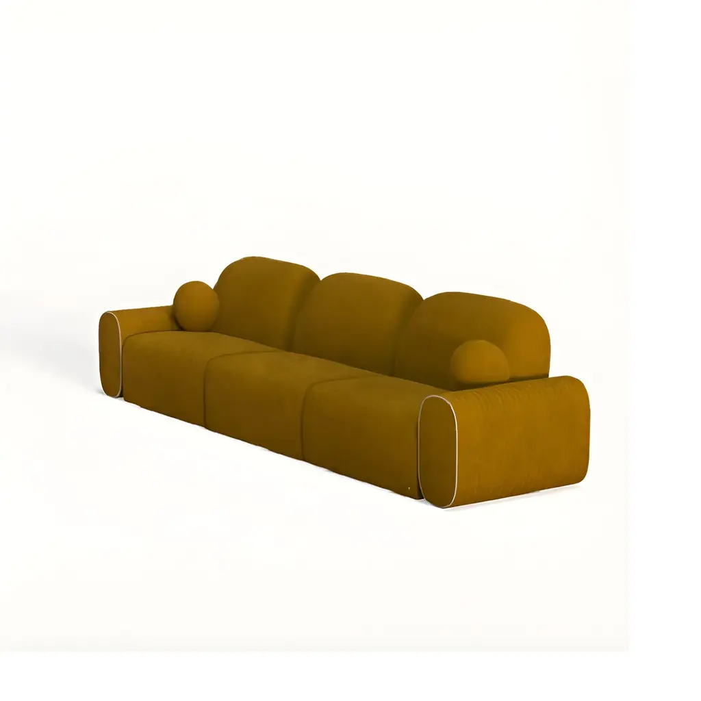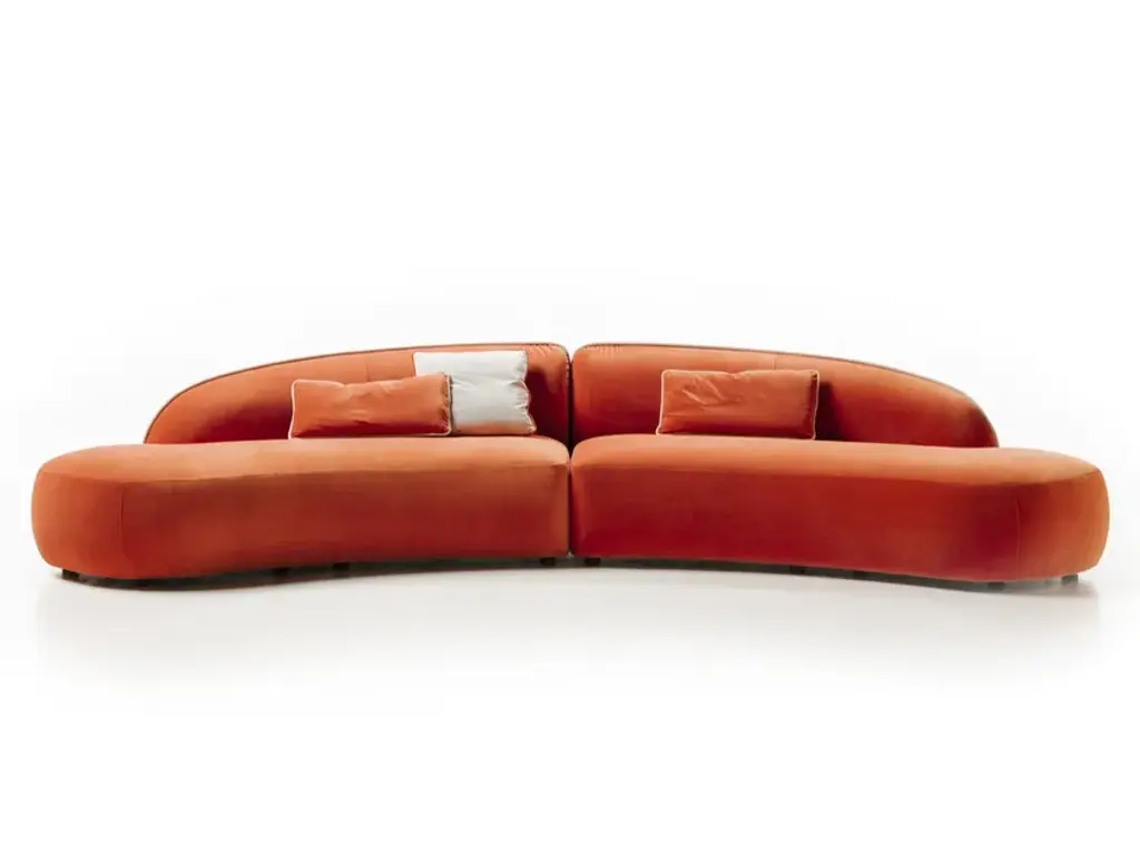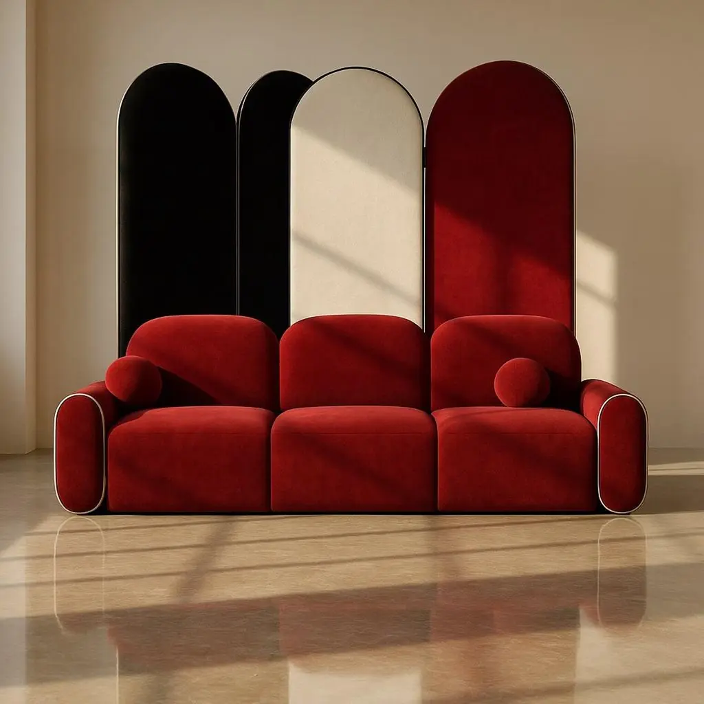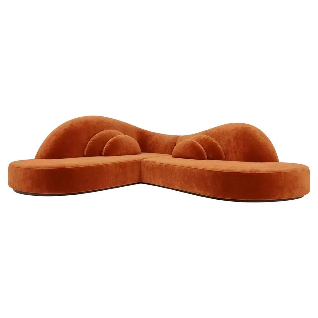Crafted for both comfort and modern style, this striking sofa is upholstered in a luxurious deep red velvet. Its unique silhouette features three generously cushioned sections, creating a plush, inviting look. The design is softened by gentle curves and rounded edges, while a subtle trim elegantly outlines the arms, adding a touch of sophistication. This sofa seamlessly combines bold color with a refined, contemporary form, making it a stunning centerpiece for any living space.. Materials:Upholstery : Red Velvet and White PipingContact us to enquire about COM/COL production, requirements and material shipping instructions.Please contact us if you have any questions about customization and pricing. We will be glad to check with the factory’s technical team if sizes, finishes, and colors can be customized. We do our best to expedite production and to ship and deliver product within the listed lead time, however current lead times might be longer due to global shipping backlog and delays. These delays are out of our control and cannot be a reason to cancel an order.