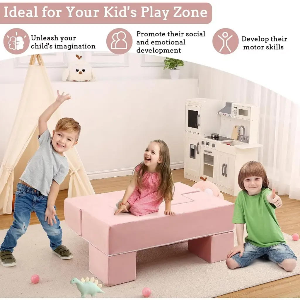 Coucheta 6-piece Kids Play Couch - Modular Toddler Foam Sofa With Removable Cover, Convertible For Playroom Bedroom, Pink
