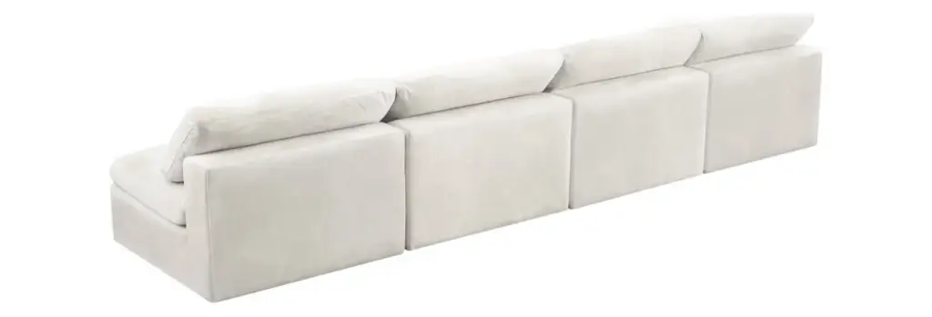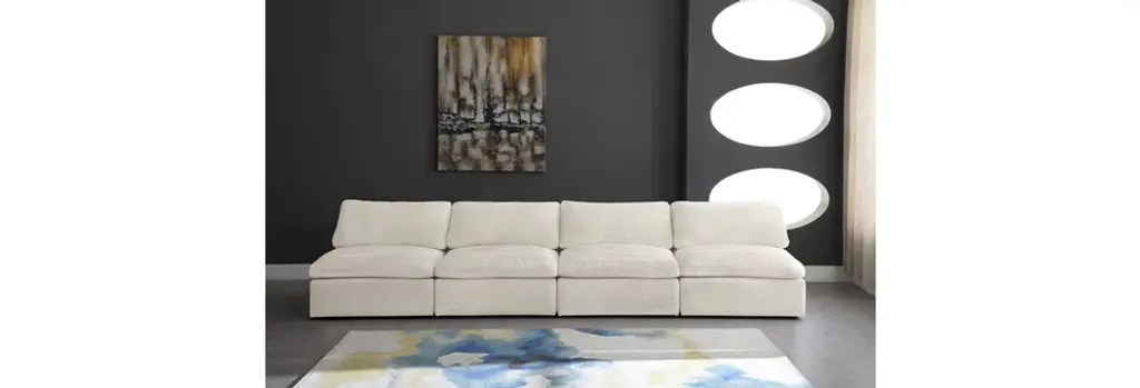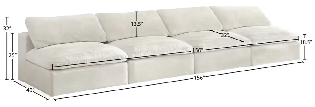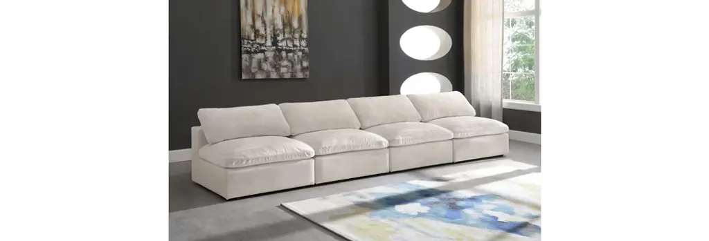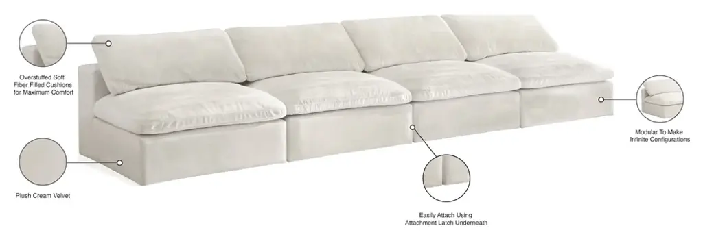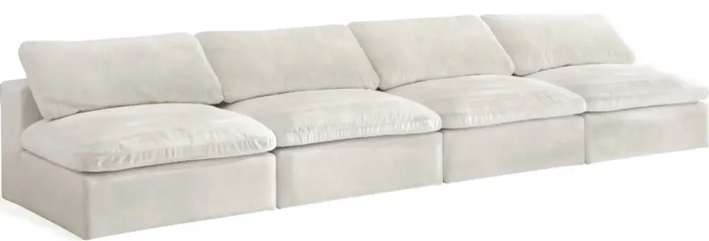 Bring home this Cozy armless sofa for a fresh new look. Embrace casual elegance with this Cozy velvet cloud-like comfort modular fiber-filled seating option. Handsome from all angles, this piece features soft cream velvet upholstery to make it an easy fit in any room. This modular piece can be combined with other items in the Cozy collection to create a seating group of your dreams. The cushions on this piece are exceptionally comfortableand filled with fiber for luxury that you deserve as you rest and relax.Overall Product Dimensions: 156" W x 40" D x 32" HCloud-Like ComfortSoft Cream VelvetOverstuffed Soft Fiber Filled Cushions for Maximum ComfortModular To Create Infinite ConfigurationsOverall Height 35" When Back Cushion Fully UprightContemporary DesignEasily Attach Using Attachment Latch UnderneathSeat Dimensions: 156" W x 32" D x 18.5" HBack Height: 13.5"