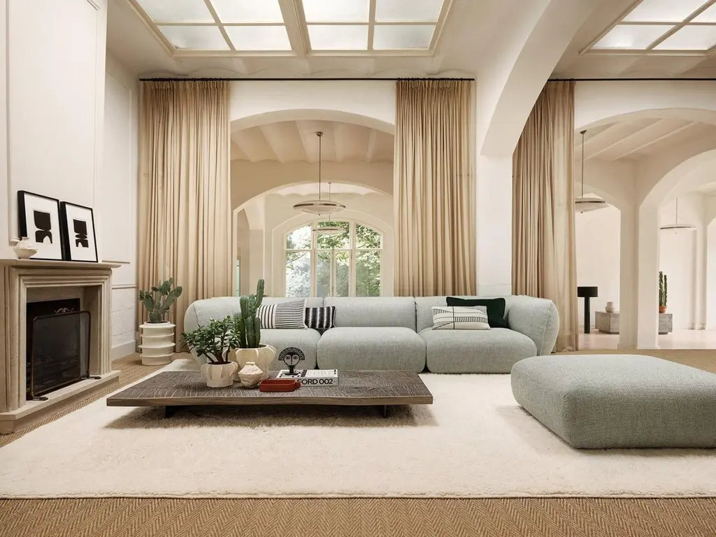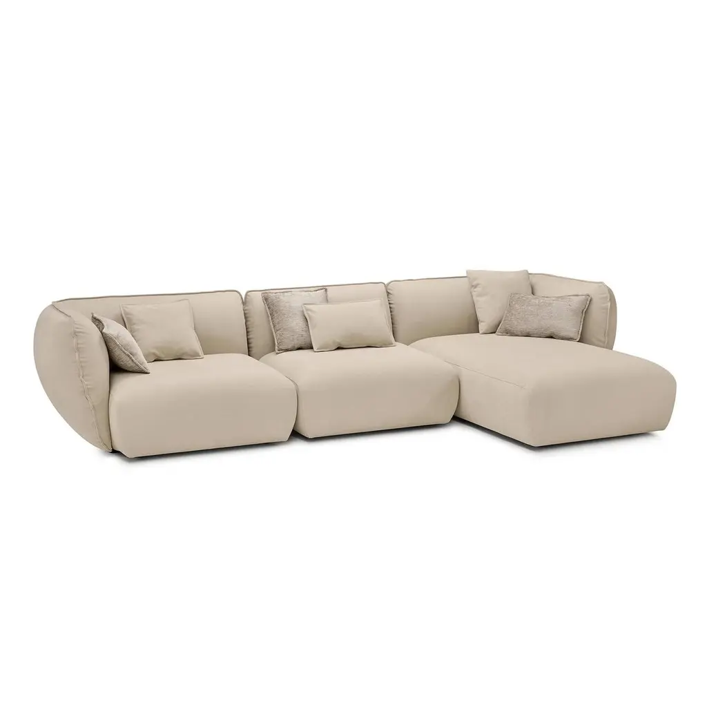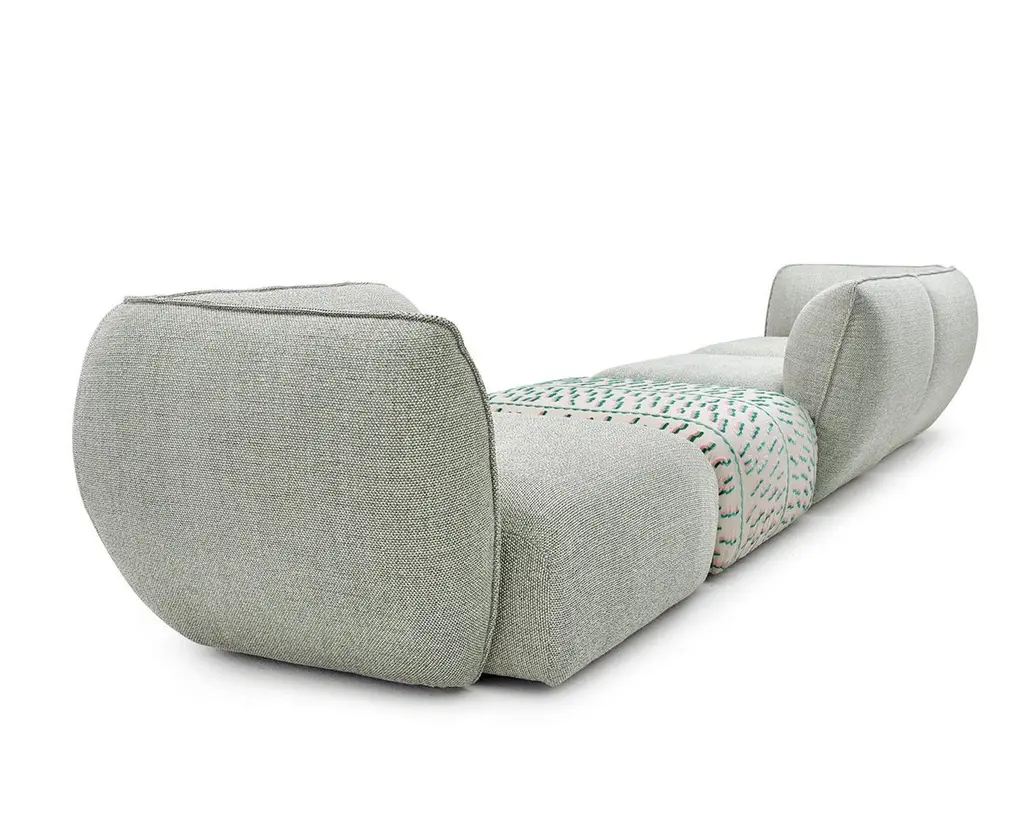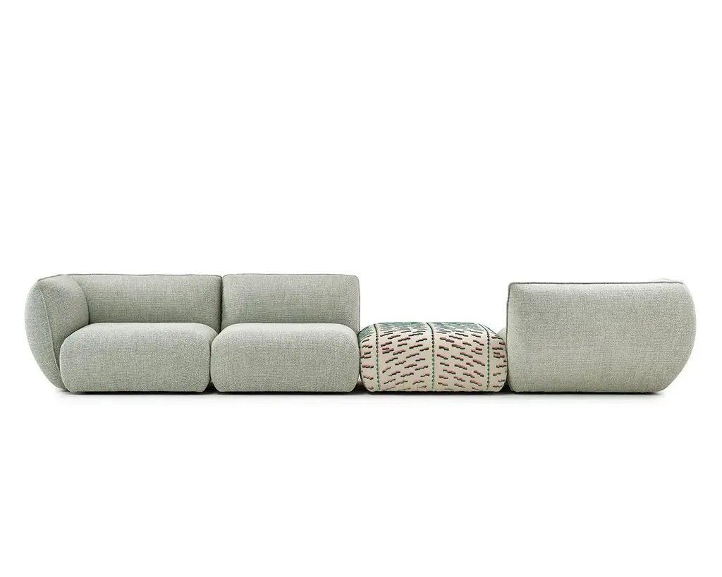 2 end modules ( 120cm Wide each)1 middle piece (90cm W)1 ottoman (94cm W)A true love story.With Mia, German designer Ilja Huber has developed a sofa system that embodies the perfect fusion of soft seating comfort and classic design.The versatile appearance of the sofa is characterised by flexibly positionable back and armrests, which are reminiscent of large-format cushions that catch the seated person.Mia is characterised by its modular conception, which allows the sofa to be adapted in size and shape to individual wishes and environments.