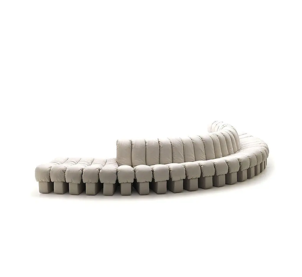 Launched in 1972, DS-600 is an indestructible, variable modular system of upholstered furniture consisting of individual, addable armchair elements. These consist of an L-shaped hard foam core covered with a down-lined and leather-covered cushion. The elements are connected with a plug-in hinge and a construction made of hide and zipper. The stool element complements the famous snake-shaped seat with an intermediate and end element.The longest DS-600 currently stands in the palace of the ruling family of a sultanate – where legendary 406 upholstery elements in rainbow colors join up to create a circular or serpentine endless sofa. The affectionately named “Tatzelwurm” sculpture also took up residency in the living rooms of Tina Turner, Jerry Hall and Mick Jagger and became the “star” of numerous Bond films – New York’s legendary “Studio 54” also adorned itself with the trendy sofa designed by a Swiss designer collective in the early 1970s. The idea of a convex and concave curved sofa was brilliant, but transforming it into a producible item of seating furniture proved more difficult than anticipated. Together with the de Sede development team, the designer collective spent a year building countless prototypes; almost all of them were criticized and rejected. But the designers showed nerves of steel, and DS-600 gradually became what it is today: an indestructible, variable modular system of upholstered furniture consisting of individual, addable armchair elements.Additional information:Material: FabricModel: DS/600 Combination, composed of: 1 Module /20, Modules /17, and Module /25Type: Nappa leather, lighty pigmentedThickness: 1.2 to 1.4 mmCharacteristics: Meticulous processing preserves the natural quality – with a characteristic pattern of creases, grain and pores. After tanning, it is dyed with a special finish to maintain the natural aura while also offering improved protection. It undergoes visible ageing, lending it an endearing patina.Dimensions: Middle Seat Section: W 24 x D 100 x H 74 cmEnd Sections With Armrest: W 26 x D 100 x H 74 cmStool Intermediate element: W 24 x D 100 x H 40 cmAvailable in other upholstery options: Living, touch, naturale, club, coloral, craft, velour, cirrus and cumulusAvailable in different structural versions.