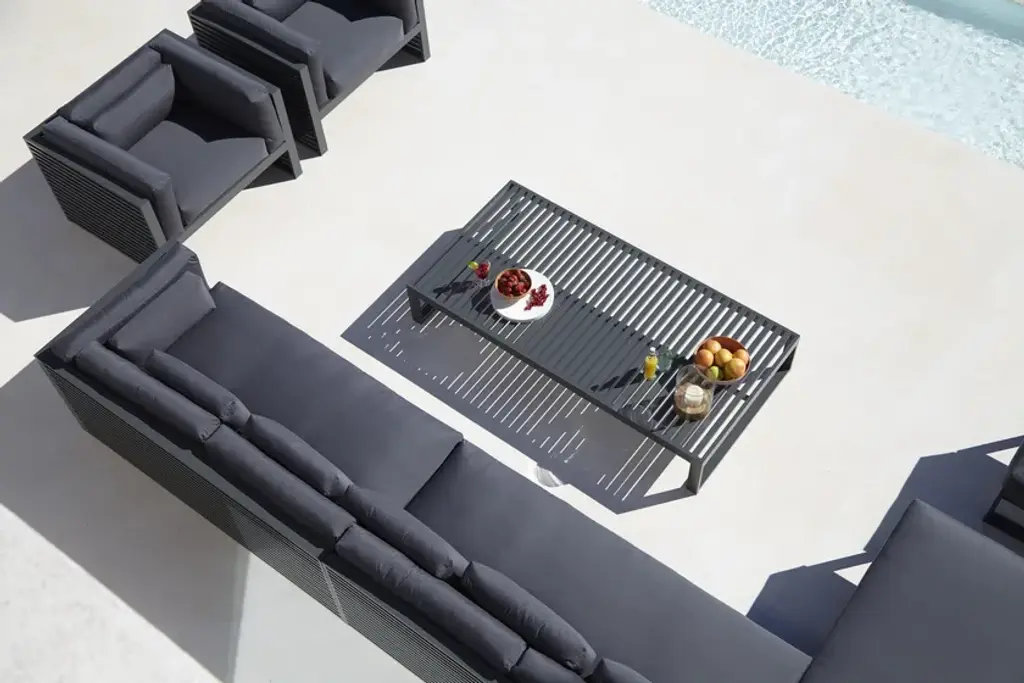 “I have always felt attracted by the patterns of light and shadows filtering through Mediterranean shutters, as well as by the work of certain architects from the Far East who work with wooden slats and bamboo cane. DNA is an outdoor furniture collection that reinterprets the essence of these horizontal shapes.”José A. Gandía-BlascoDNA is a collection of outdoor furniture inspired by the subtle play of the modulations of light and shadows filtering through Mediterranean shutters and it praises the shadows of Japanese aesthetics in traditional and contemporary architecture – the positive and the negative dispossessing any superfluous adornment.Made of anodized or thermo-lacquered aluminium profiles. Polyurethane foam rubber covered with water-repellent fabric. Removable fabric cover.Collections colour sample: anodized, white, agate grey, cement grey, sand, bronze, wine red, blue grey, grey blue, signal grey, anthracite and black.