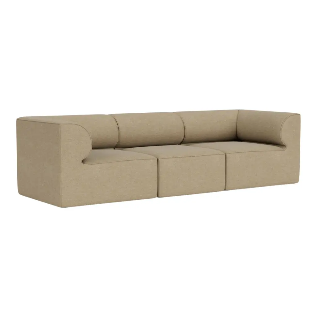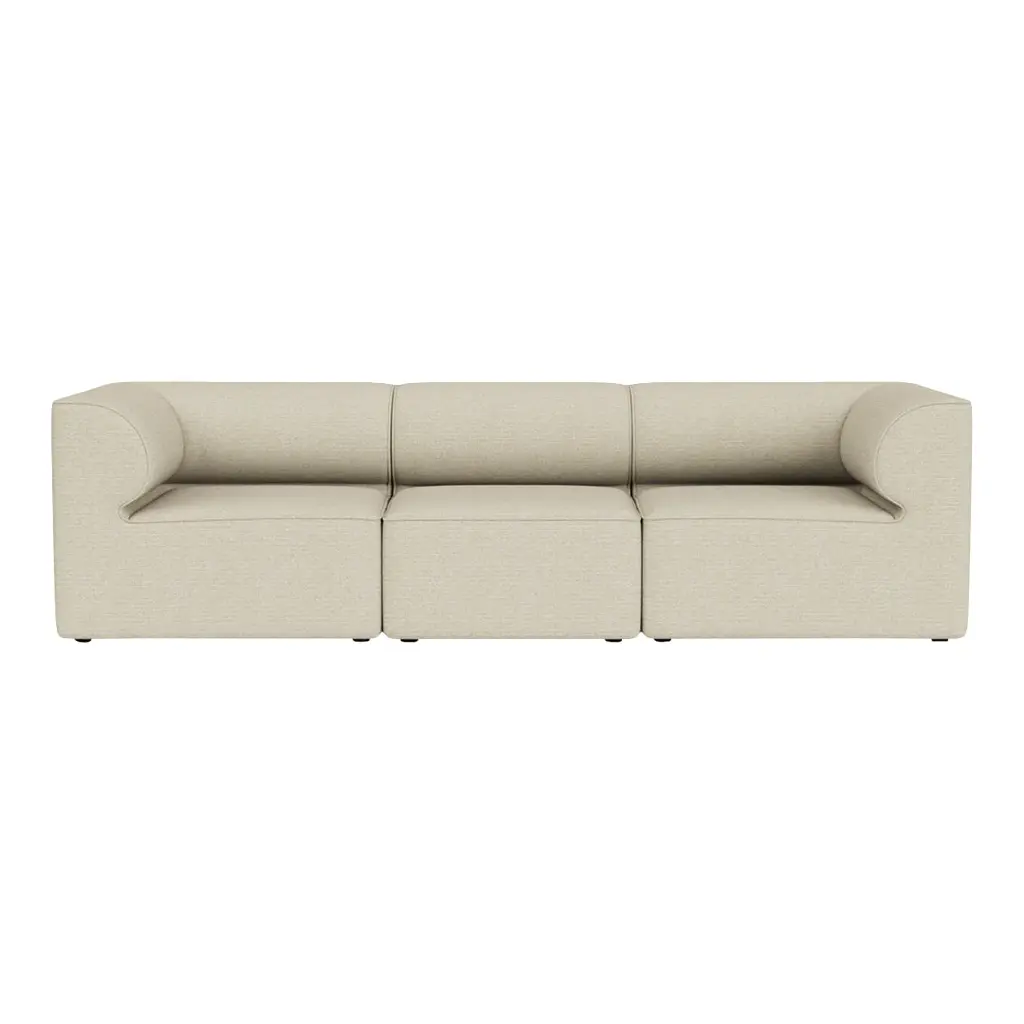 The Eave Modular Sofa 3-Seater Configuration 2 from Audo Copenhagen transforms living spaces through architectural presence and generous proportions. Created by the acclaimed Norm Architects studio, this thoughtfully composed arrangement combines two corner modules with an open section module to create a substantial three-seater that balances visual lightness with exceptional comfort. The distinctive design takes its name from the "eaves" of a roof, a concept elegantly expressed in the curved backrests that create a protective, embracing sensation. This configuration creates substantial seating that accommodates three adults with perfect comfort. The arrangement positions corner modules at each end with an open section in the center, creating a harmonious composition that maintains the collection's architectural character while maximizing seating capacity. The clean geometric lines are softened by the distinctive curved elements, resulting in a sofa that enhances rather than dominates its surroundings. Exceptional craftsmanship defines every aspect of this configuration from the robust internal structure of pine, plywood, and MDF to the system of no-sag springs and high-resilience foam that provides consistent comfort while maintaining its shape through years of use. The precision-engineered seat proportions strike the perfect balance between support and relaxation, creating a versatile seating experience that adapts to various activities throughout the day. Available in a range of premium upholstery options, this three-seater allows for personalization while maintaining its distinctive character. Perfect for creating primary seating in spacious living environments, establishing sophisticated conversation areas in hospitality settings, or defining zones within open-concept spaces, Configuration 2 exemplifies Norm Architects' "soft minimalism" approach where nothing can be added or taken away without compromising the design's integrity. This complete arrangement offers a turnkey solution while maintaining the flexibility to reconfigure or expand your seating arrangement over time, embodying the thoughtful versatility that defines the entire Eave collection.