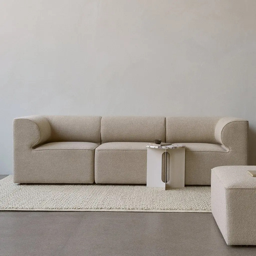 The Eave Modular Sofa 3-Seater Configuration 2 from Audo Copenhagen transforms living spaces through architectural presence and generous proportions. Created by the acclaimed Norm Architects studio, this thoughtfully composed arrangement combines two corner modules with an open section module to create a substantial three-seater that balances visual lightness with exceptional comfort. The distinctive design takes its name from the "eaves" of a roof, a concept elegantly expressed in the curved backrests that create a protective, embracing sensation. This configuration creates substantial seating that accommodates three adults with perfect comfort. The arrangement positions corner modules at each end with an open section in the center, creating a harmonious composition that maintains the collection's architectural character while maximizing seating capacity. The clean geometric lines are softened by the distinctive curved elements, resulting in a sofa that enhances rather than dominates its surroundings. Exceptional craftsmanship defines every aspect of this configuration from the robust internal structure of pine, plywood, and MDF to the system of no-sag springs and high-resilience foam that provides consistent comfort while maintaining its shape through years of use. The precision-engineered seat proportions strike the perfect balance between support and relaxation, creating a versatile seating experience that adapts to various activities throughout the day. Available in a range of premium upholstery options, this three-seater allows for personalization while maintaining its distinctive character. Perfect for creating primary seating in spacious living environments, establishing sophisticated conversation areas in hospitality settings, or defining zones within open-concept spaces, Configuration 2 exemplifies Norm Architects' "soft minimalism" approach where nothing can be added or taken away without compromising the design's integrity. This complete arrangement offers a turnkey solution while maintaining the flexibility to reconfigure or expand your seating arrangement over time, embodying the thoughtful versatility that defines the entire Eave collection.