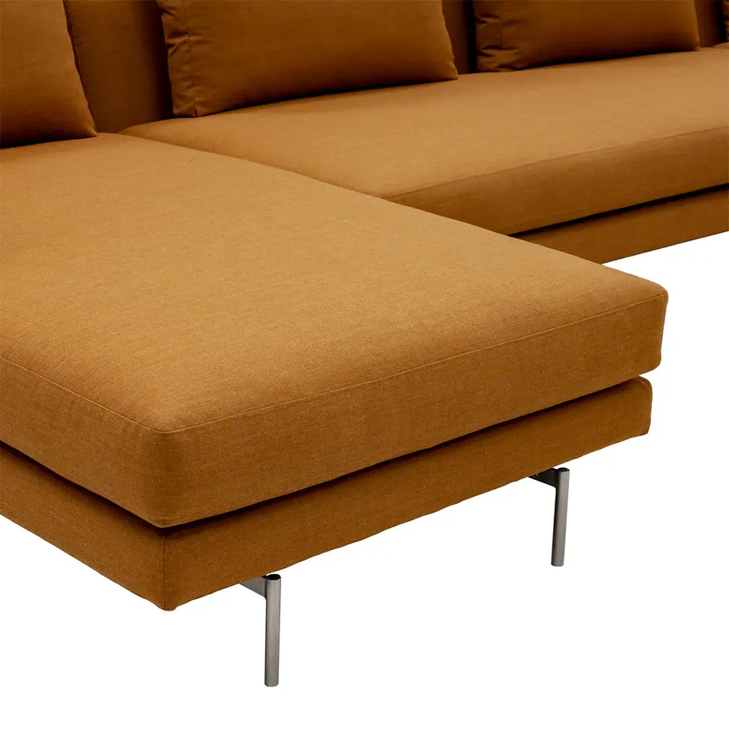 The Edge V2 Sofa takes its origin point in the idea of lines, running between its frame and cushion for a slight, elegant gap, across its linear armrests and throughout its soft, loose pillows. The design floats on a delicately designed base of steel.