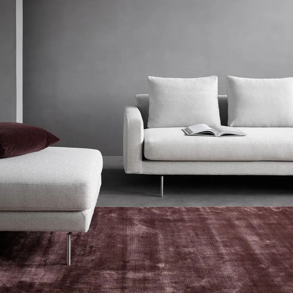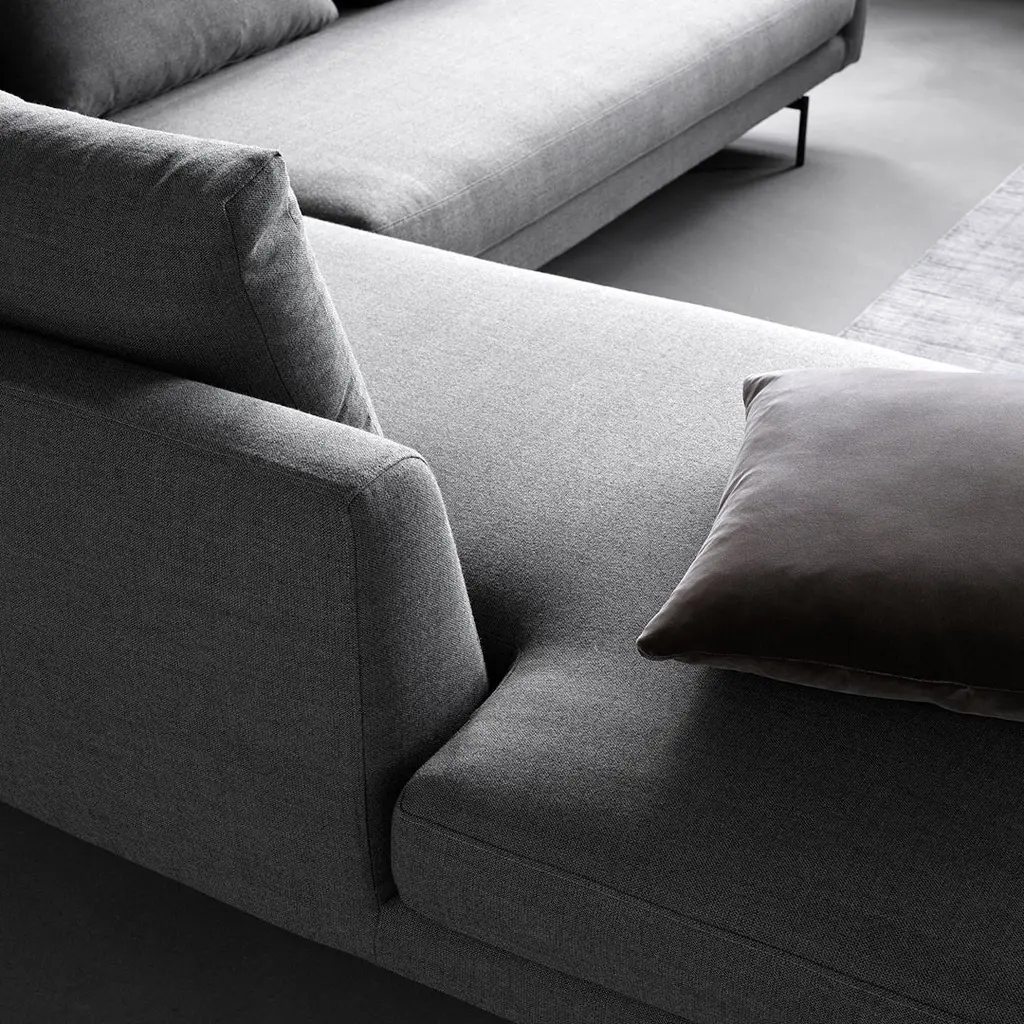 The Edge V2 Sofa takes its origin point in the idea of lines, running between its frame and cushion for a slight, elegant gap, across its linear armrests and throughout its soft, loose pillows. The design floats on a delicately designed base of steel.