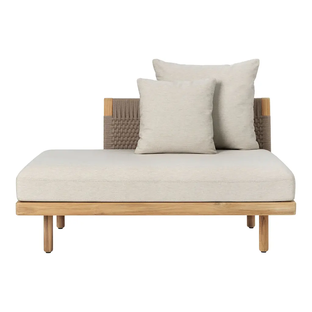 Designed by EOOS, the Embrace Outdoor Lounge Series is characterized by balancing soft upholstery and stringent wood perfectly. The modular sofa encourages outdoor relaxation with its comfortable upholstery and laid-back look, and, at the same time, it has a tight and contemporary idiom with its woven arm- and backrests and teak frame *Note: Side, armrest, and sidetable can be placed on both left and right side of a seat cushion.