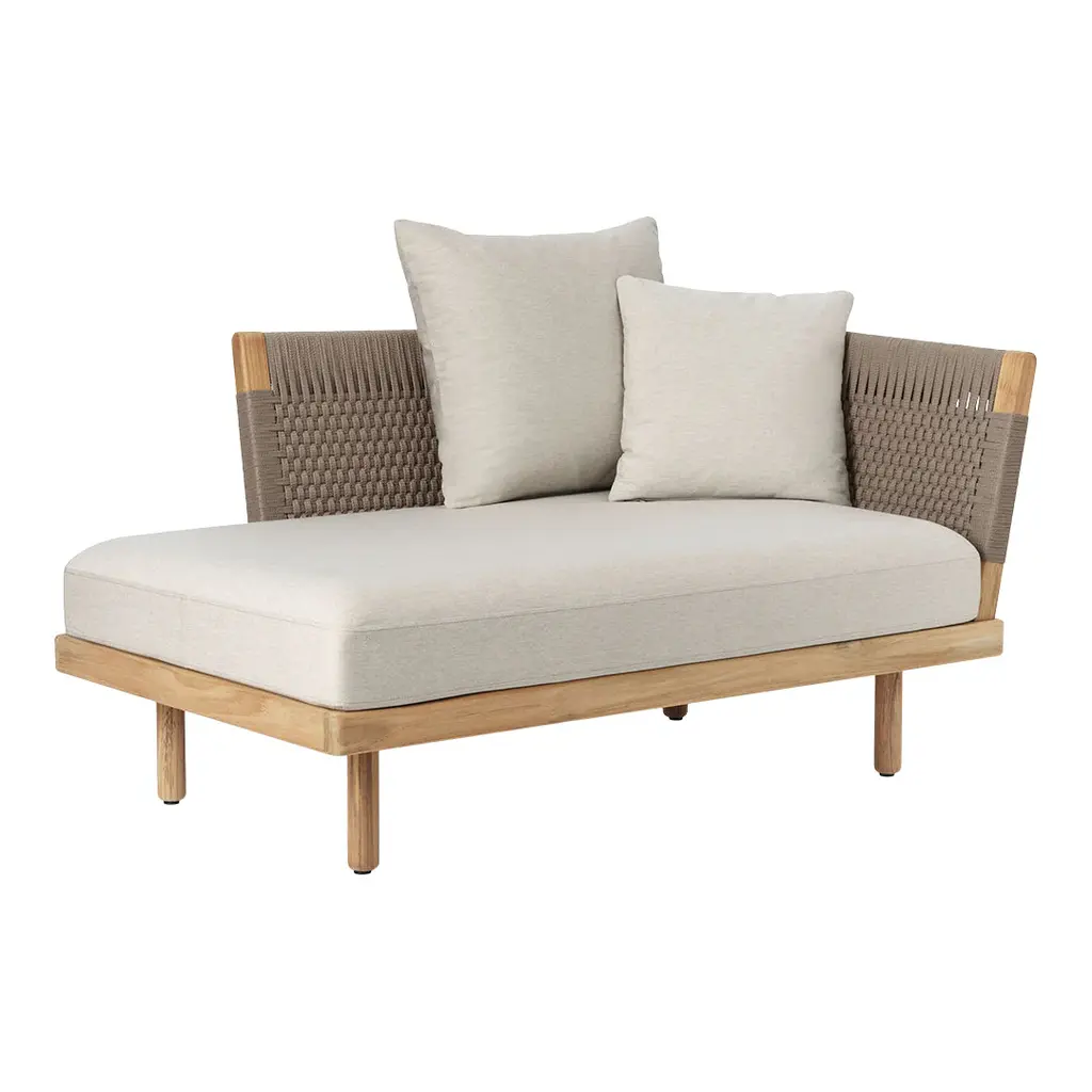 Designed by EOOS, the Embrace Outdoor Lounge Series is characterized by balancing soft upholstery and stringent wood perfectly. The modular sofa encourages outdoor relaxation with its comfortable upholstery and laid-back look, and, at the same time, it has a tight and contemporary idiom with its woven arm- and backrests and teak frame *Note: Side, armrest, and sidetable can be placed on both left and right side of a seat cushion.