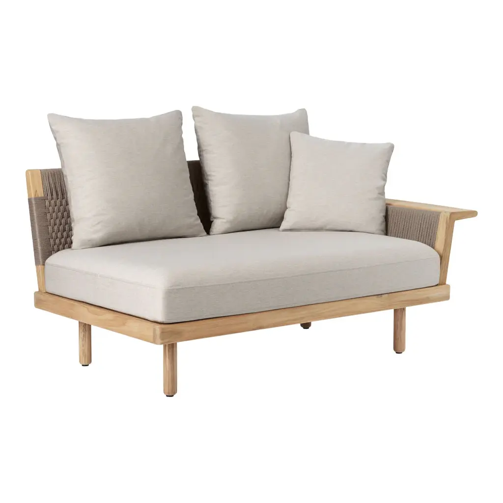Designed by EOOS, the Embrace Outdoor Lounge Series is characterized by balancing soft upholstery and stringent wood perfectly. The modular sofa encourages outdoor relaxation with its comfortable upholstery and laid-back look, and, at the same time, it has a tight and contemporary idiom with its woven arm- and backrests and teak frame *Note: Side, armrest, and sidetable can be placed on both left and right side of a seat cushion.