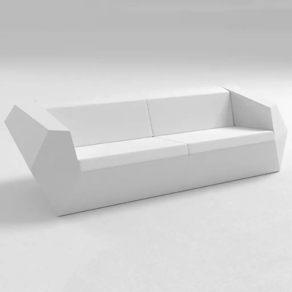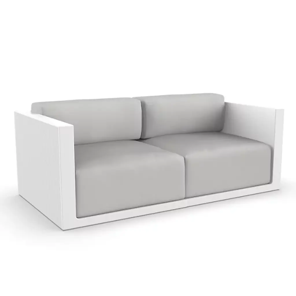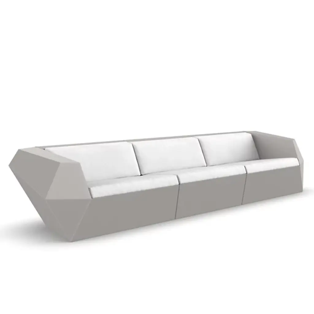 This Faz 2 Seater Outdoor Modular Sofa by Vondom features timeless, mineral, and emphatic shapes that blend perfectly into interior and outdoor environments. Made of rotational molded resin, polyethylene, and soft acrylic fabric, it is suitable for both interior and exterior use. The 100% recyclable material is perfect for creating a blissful atmosphere and is designed for maximum comfort. With adjustable modularity, you can adapt the piece to your style and needs, all while keeping a cohesive look. Experience beauty and sophistication with this exquisite sofa set.