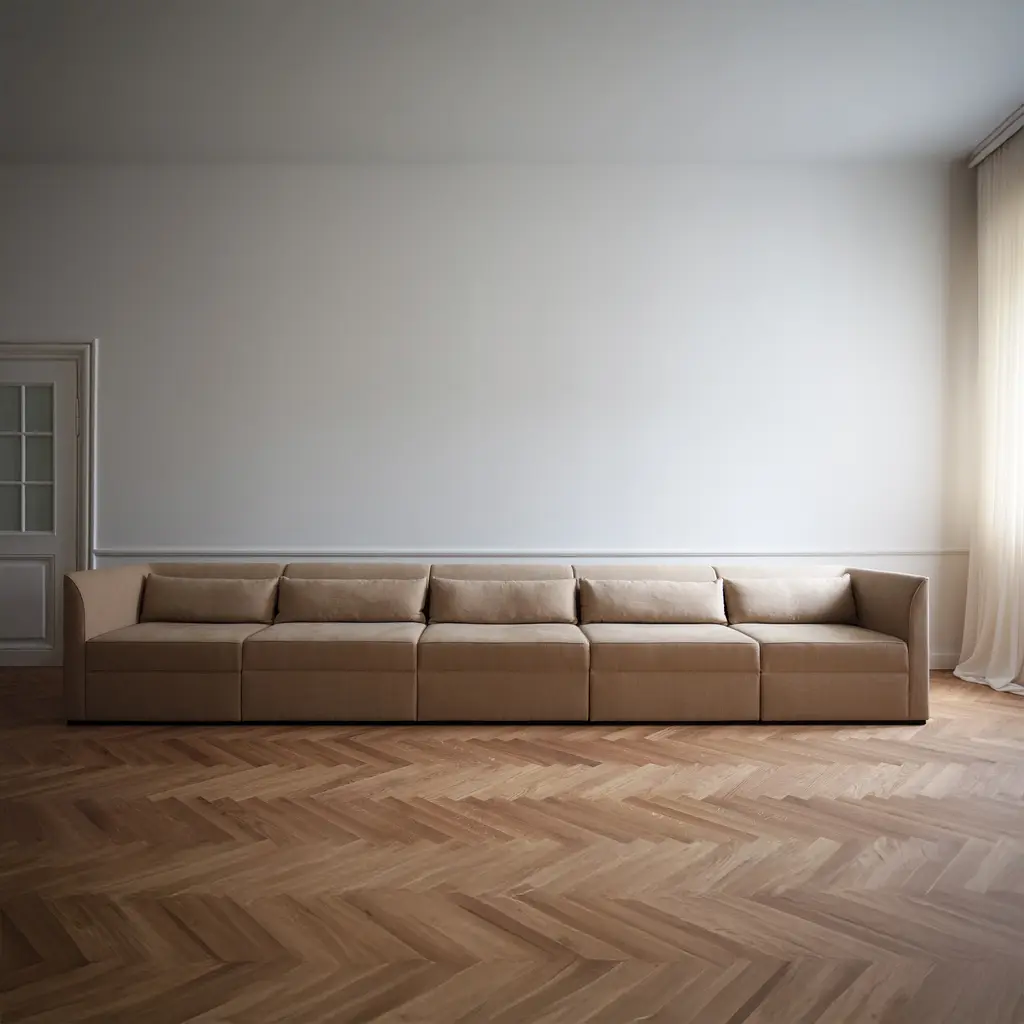 The Femme Modular Sofa is designed as a flexible seating system with five units that can be arranged to suit different spaces, making it suitable for both residential and contract settings. It features a fully upholstered body. Customization options include a selection of fabrics and leathers.