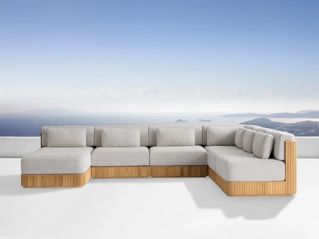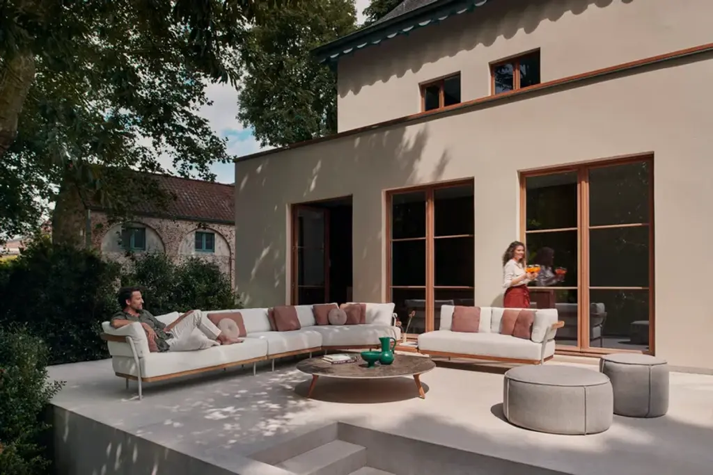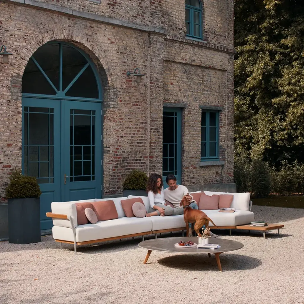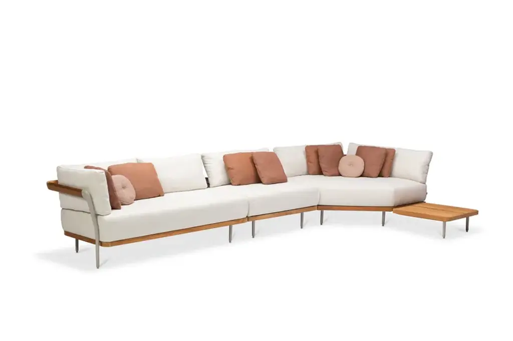 Flows unites a world of contrasts: limber yet strong, this collection features a light, elegant aluminium frame combined with the warmth of a handcrafted wood finish. Flows carefully balances old and new to give the pieces their defining characteristics. The unique shape of the oval legs turns the Flows sofa into a one-of-a-kind piece of furniture destined for long-lasting appreciation.Created in collaboration with Milanese design studio Metrica, Flows fuses traditional aesthetics with modern elements to evoke an atmosphere of nostalgia and lightness. The concept of Flows is about connecting wood and aluminium and the different feelings both materials evoke. While the elegant metal casting creates a strong and sober foundation for the design, the wood evokes feelings of comfort and warmth. Flows will be available in two versions: teak natural and teak nero. Both can be combined with soft cushions in warm colour combinations.At its most basic, Flows is a suspended sofa solution that consists of modular as well as fixed elements. The main components are the aluminium cast legs. On the upper level of the sofa, these connect with a solid wood profile that serves as an armrest and a support for the back cushions. On the lower portion, the legs are attached to a structural platform covered in wood. The wood of the platform cover, arms and backrest share the same finish.The aluminium legs, which give character and lightness to the entire structure, are characterised by a unique design. Robin Rizzini, chief designer & partner at Metrica: “Instead of choosing a standard cylindrical shape, we opted for an exclusive form that is crucial to the overall feel of the Flows sofa. Starting out as cylindric shape, the legs gradually change into rounded triangles that eventually shift into an oval shape to connect to the backrest. Flows's teak nero version adds an extra touch of luxury thanks to the additional manual craftsmanship it requires. The teak wood is sanded, brushed and treated by hand using a special technique that supports the structure and creates an eyecatching alternation between shiny and matt black surfaces. As a result, the black hues radiate just the right amount of elegance, drama and power, perfectly balancing indulgence and sophistication.As its name implies, Flows offers multiple configuration options and infinite setting possibilities. The core concept consists of either a 2- or a 3-seater sofa or an armchair. Different modules – chaises, corners ecc