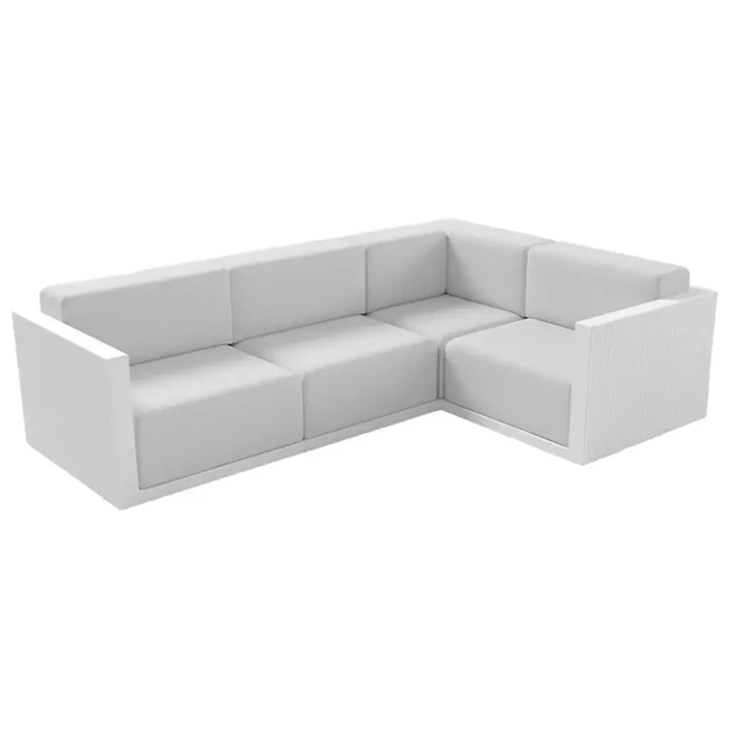 Introducing the Gatsby 4 Seater Outdoor Modular Sofa, designed by Ramón Esteve for Vondom. Inspired by the Art Déco era, this piece captures the spirit of The Great Gatsby and the extravagance of the roaring 20s. It features a high back and two armrests on each end for ergonomics and comfort. Crafted with padded foam, rotational molded polyethylene, and soft acrylic outdoor fabric, the sofa is perfect for both indoor and outdoor use as it can withstand the elements.