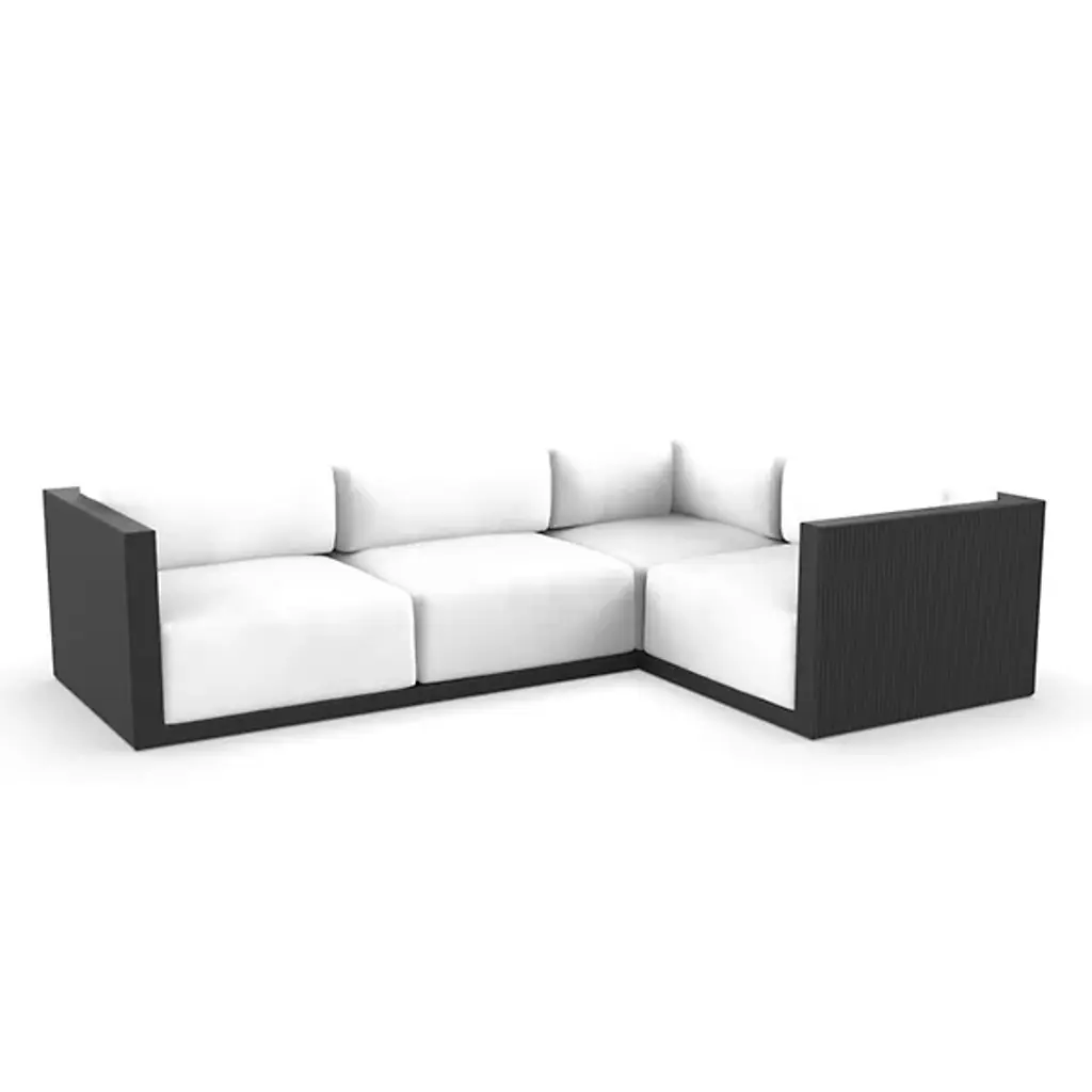 Introducing the Gatsby 4 Seater Outdoor Modular Sofa, designed by Ramón Esteve for Vondom. Inspired by the Art Déco era, this piece captures the spirit of The Great Gatsby and the extravagance of the roaring 20s. It features a high back and two armrests on each end for ergonomics and comfort. Crafted with padded foam, rotational molded polyethylene, and soft acrylic outdoor fabric, the sofa is perfect for both indoor and outdoor use as it can withstand the elements.