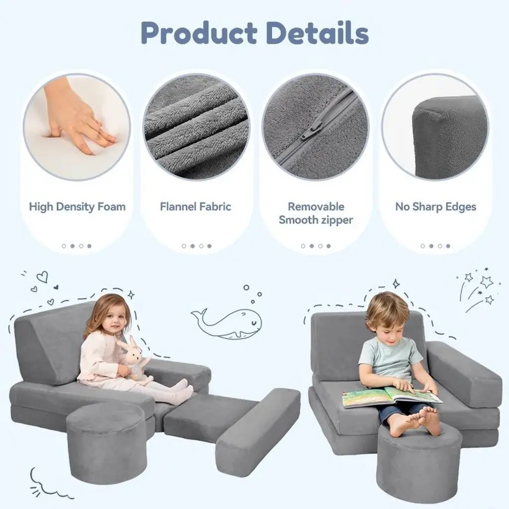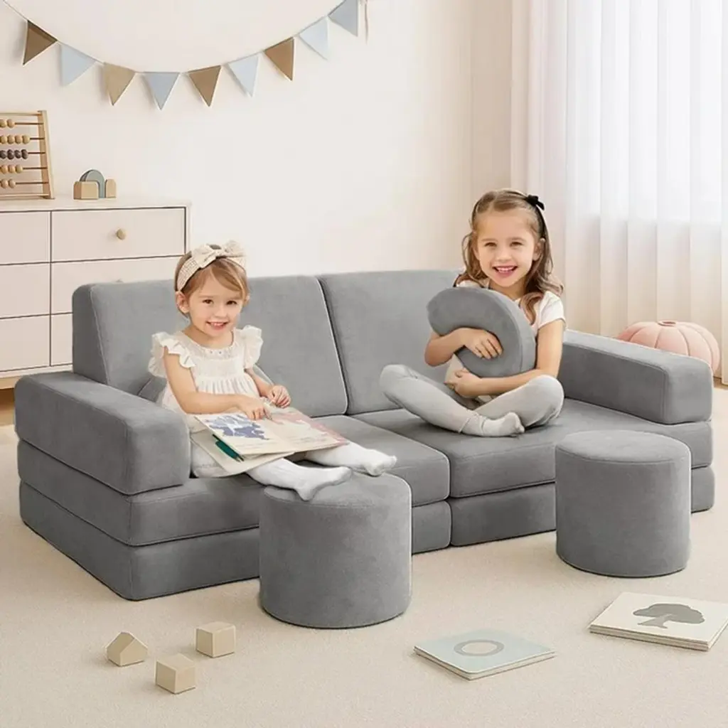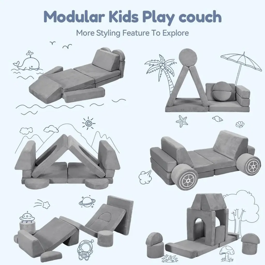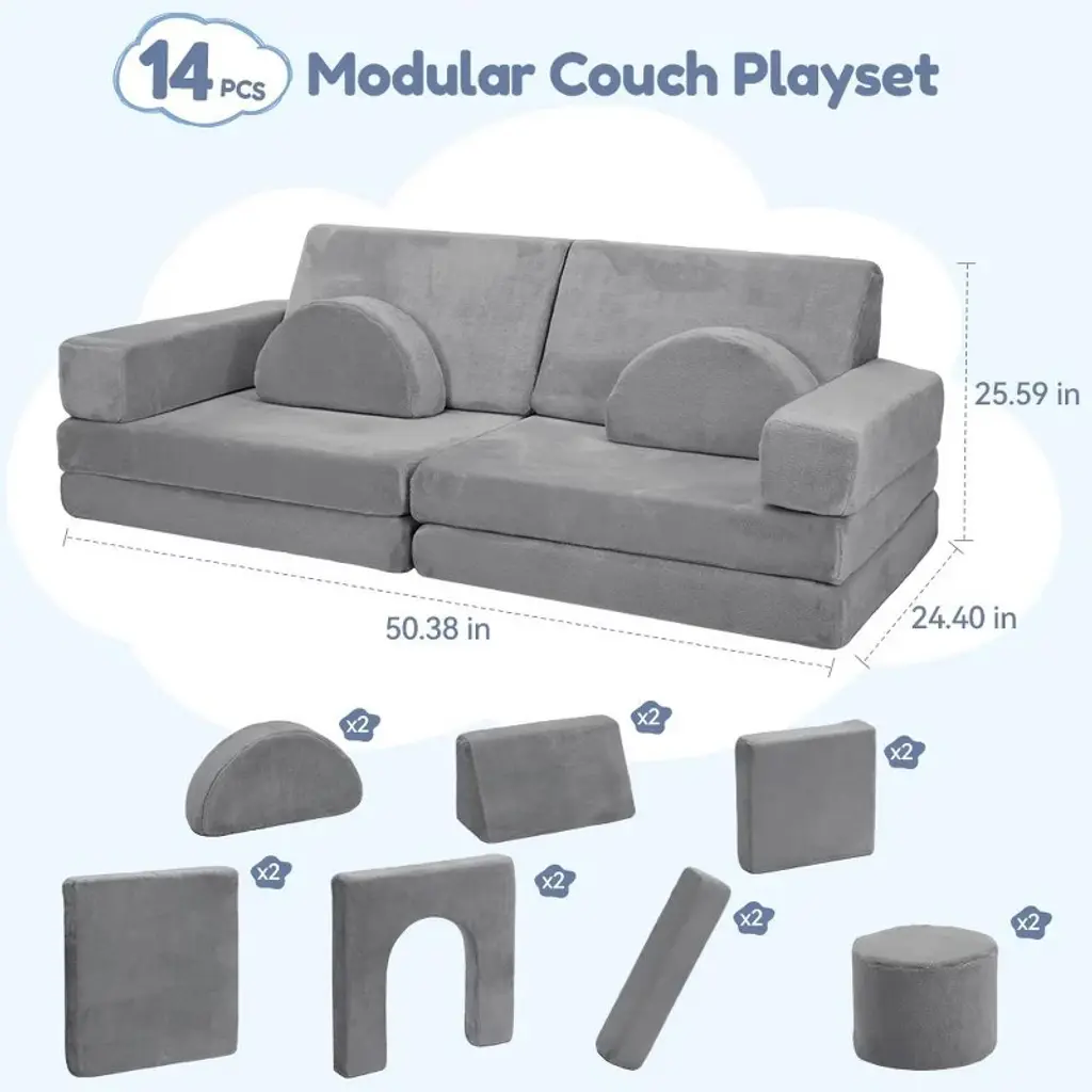 Build, Play, Imagine, Again and Again!Say hello to the ultimate playroom upgrade, our 14-Piece Modular Kids Couch, made to grow with your little one's imagination! Whether they are building castles, race cars, or a cozy reading nook, this soft, durable couch turns everyday play into epic adventures.Includes 14 versatile pieces - footstools, arches, triangles & moreMade with high-density sponge for non-stop fun (and serious lounging)Plush velvet covers that are machine washable = parent win!Great for toddlers to big kids (ages 1–8)Perfect for bedrooms, nurseries, and playroomsUnbox the magic, give it 48 hours to fully fluff, and let the creativity begin.Loved by kids, trusted by parents!#playcouch #modularkidscouch #targetfinds #toddleressentials #playroomgoalsSPECIFICATIONSOverall: 25.59" H X 24.4" W X 50.38" DKids Furniture Design: Kids Play CouchAdjustability Features: Foldable / FoldingPACKAGING INCLUDES1 x Modular Kids Couch*IMPORTANT NOTEUnboxing Guide:Thanks for bringing our Modular Kids Couch into your home! Right out of the box, it might look a little squished or not quite picture-perfect, don’t worry, that’s totally normal.To help it bounce back beautifully:Place the couch in a well-ventilated areaLet it rest and fully expand over the next 48 hoursWithin 1-2 weeks, your couch will look and feel just like new - soft, comfy, and ready for playtime adventures!CONTACT USIf you have any problems with our items or services, please feel free to contact us any time.We are always online and do our best to solve your problems and provide you with the best customer services.