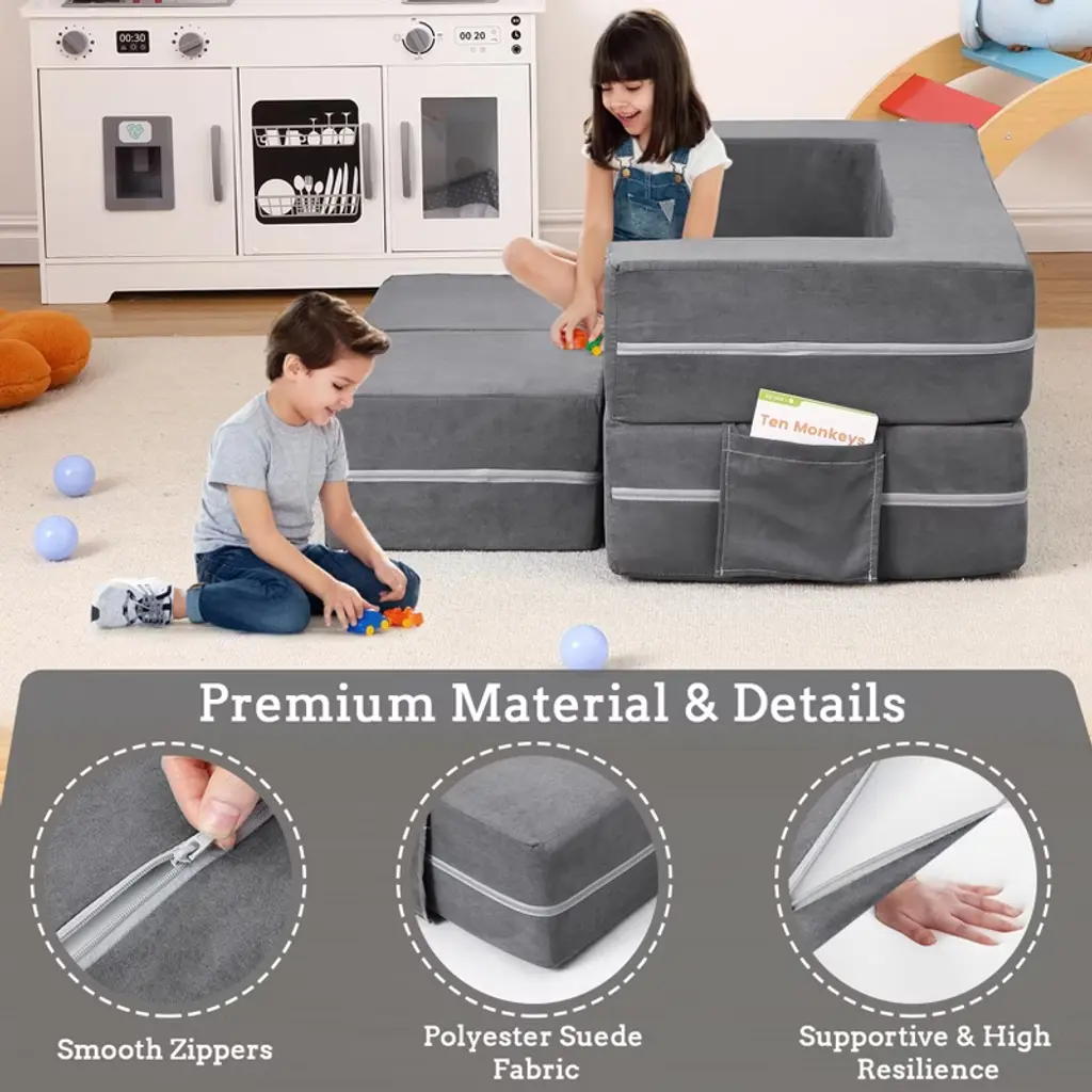 This modular play couch (19.7''D*39.37''W*15.75''H) combines ultra-soft suede fabric with high-density supportive foam to create the perfect play space for any child. The dual-purpose design transforms effortlessly into activity tables, play mats, or cozy reading nooks, featuring convenient side pockets for books or toys. Built for active toddlers, it offers durable yet skin-friendly surfaces with easy-zip removable covers that survive frequent machine washing. The foam fully expands within 1-2 days (faster with steam) to reveal plush, bounce-back cushions - no assembly or hard parts required.