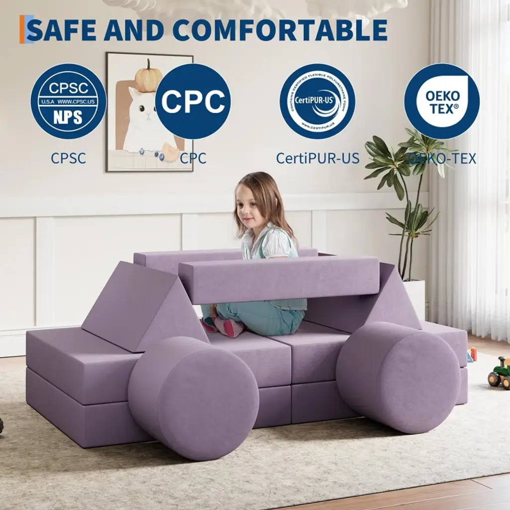 Gustowave Kids Modular Play Couch With Washable Velvet Covers, 13 Pcs Building Fort Toddler Sofa, Convertible Foam Floor Chair