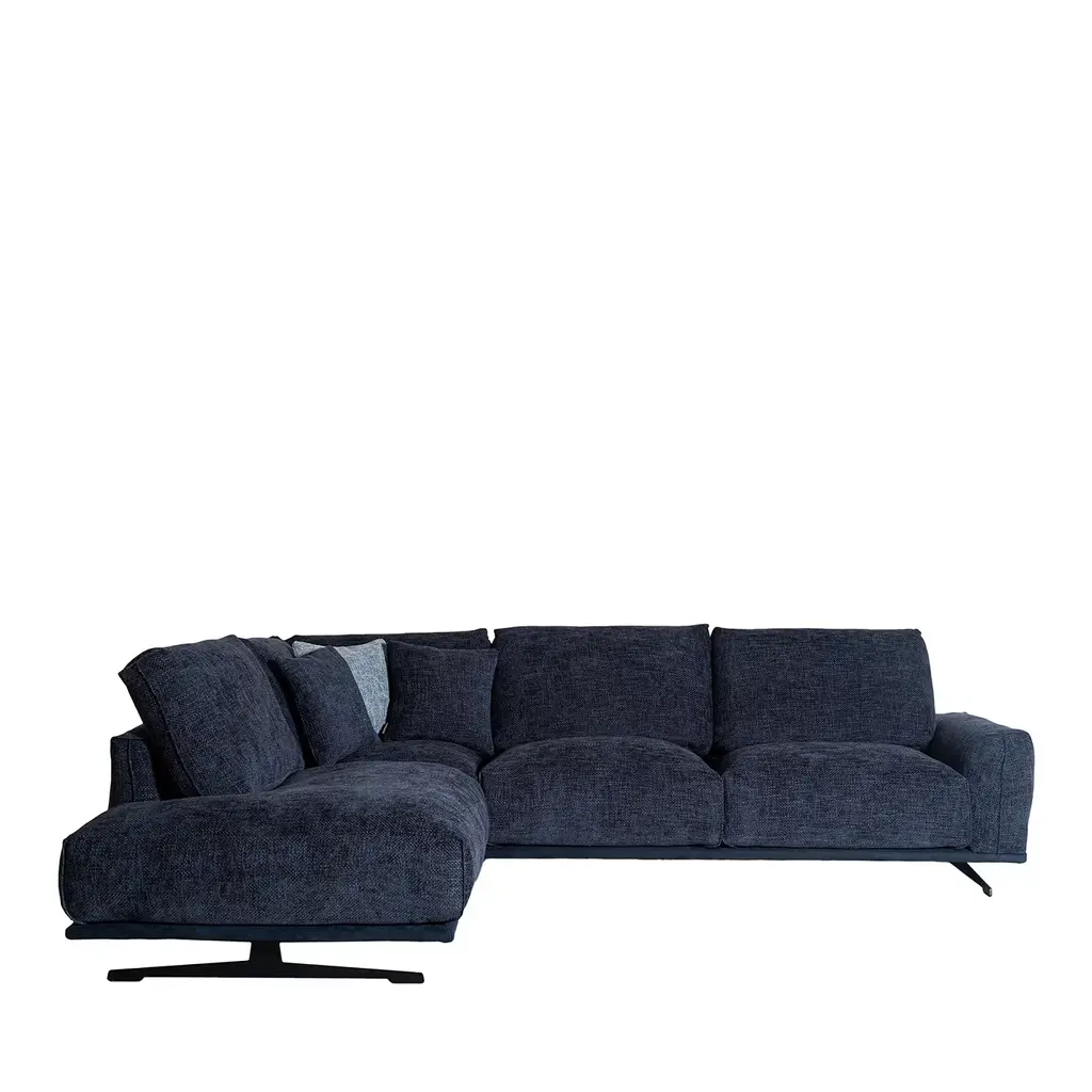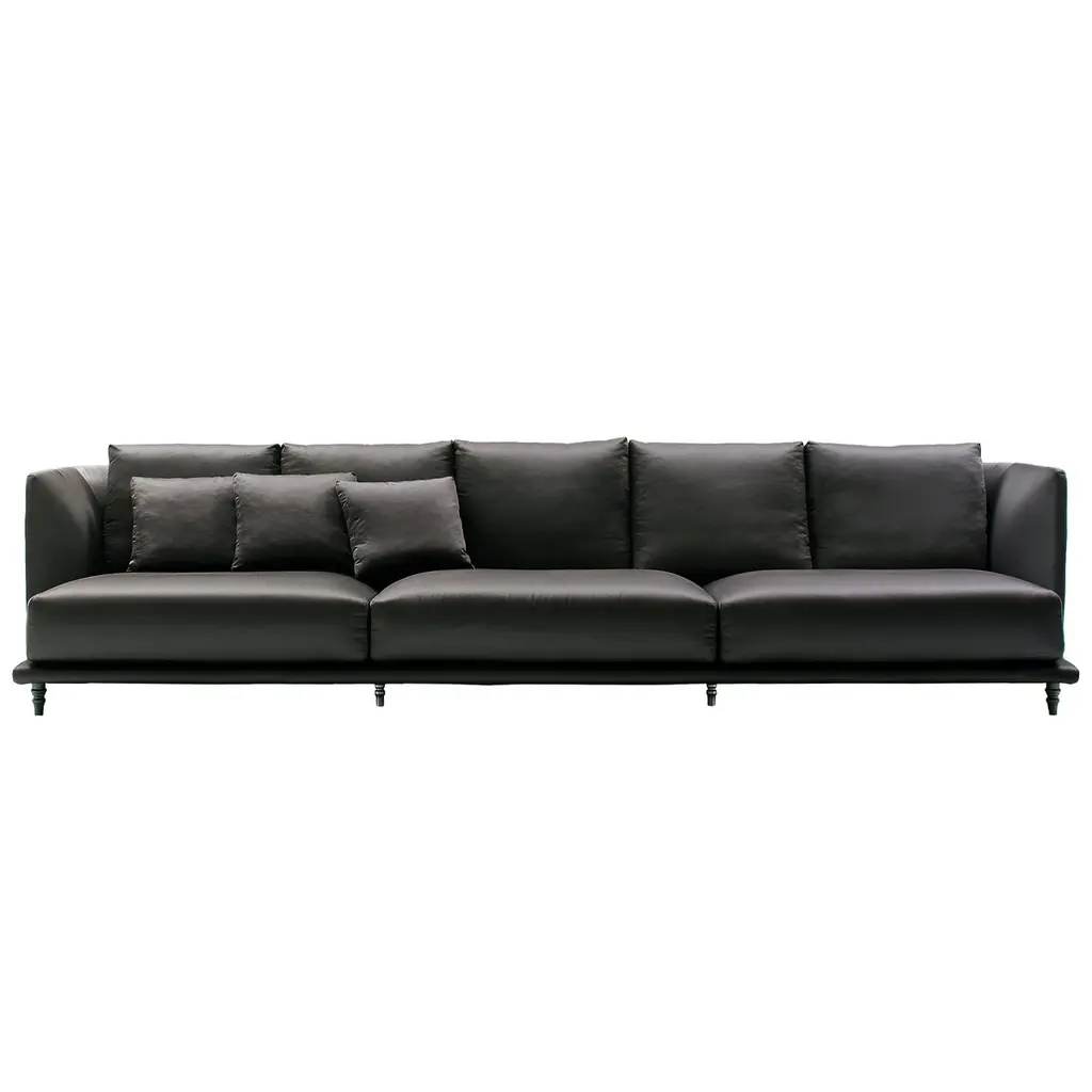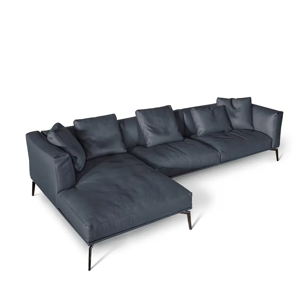 Distinguished by its blend of sturdy wooden and steel frame enveloped in high-density polyurethane foam, this modular sofa is a testament to comfort and style. Upholstered in a choice of luxurious blue leather, it boasts varying densities of foam for both seat cushions and armrests, complemented by elegantly crafted aluminum feet in a sleek black nickel finish. It includes 5 pillows in the same blue leather. Designed by Giuseppe Bavuso.