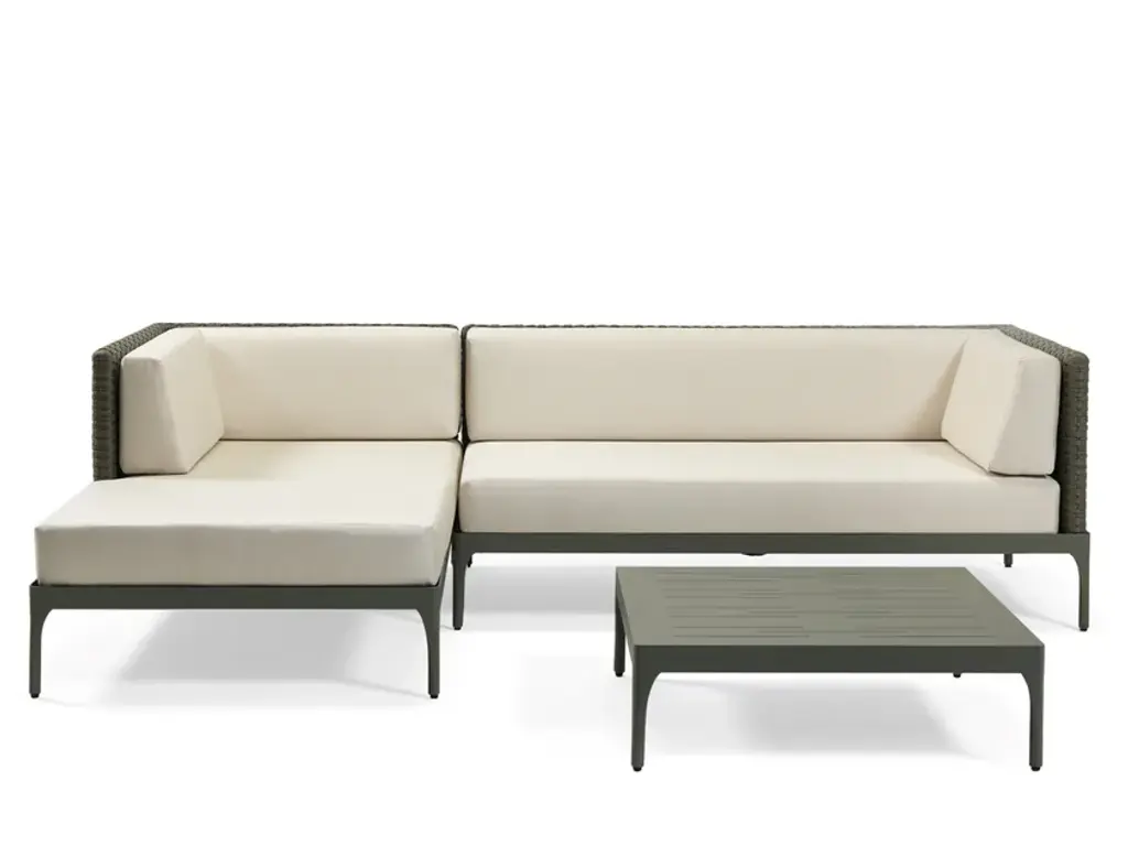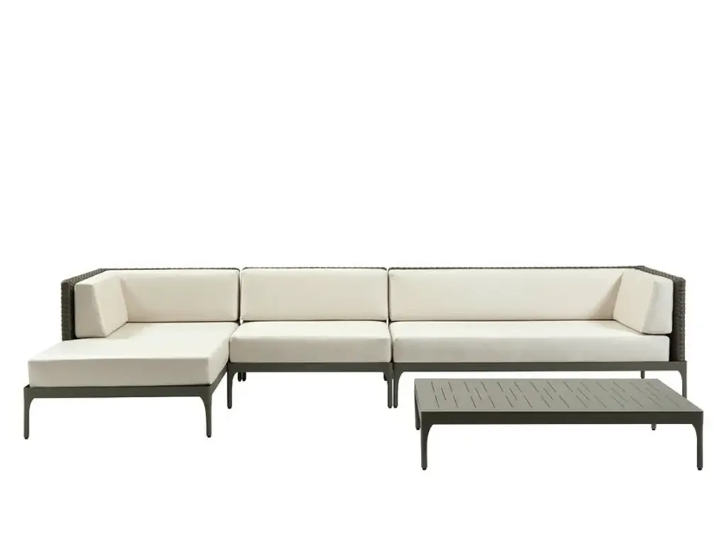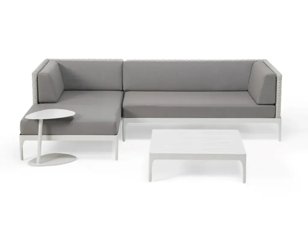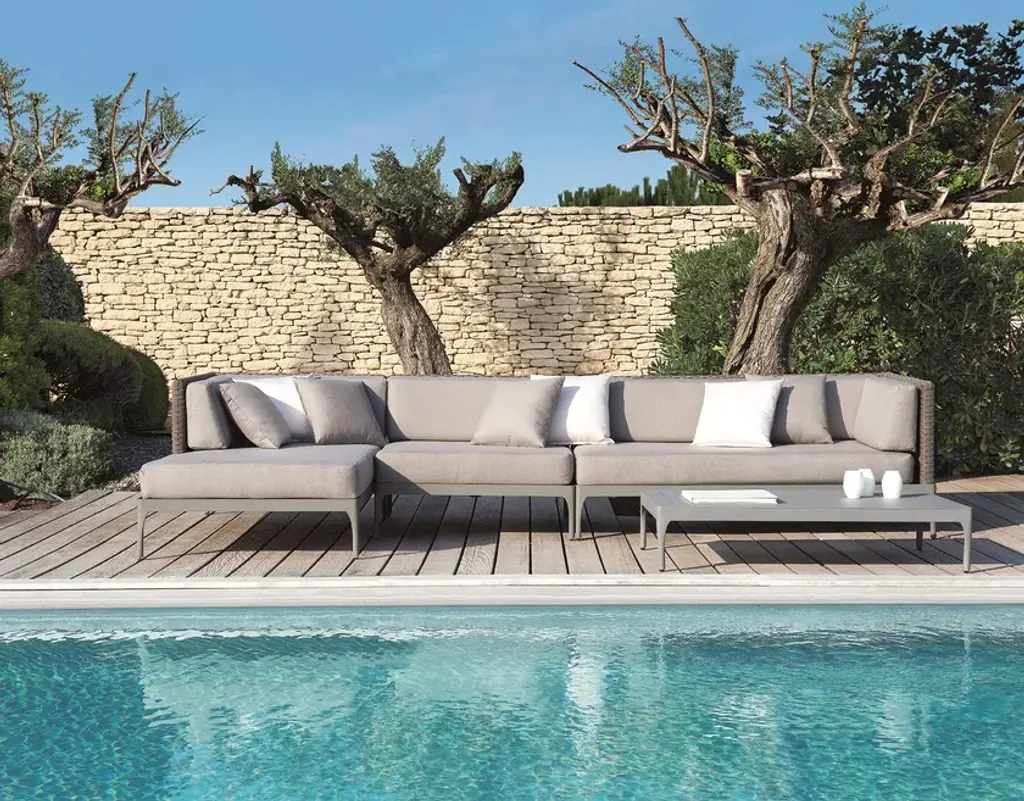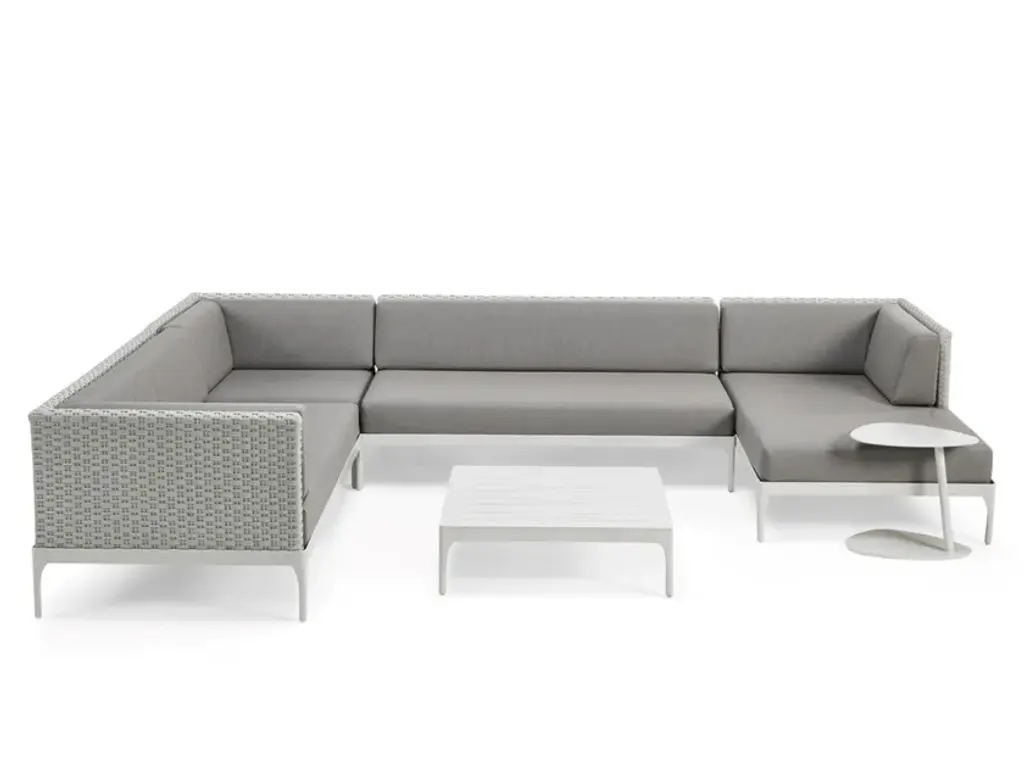 INFINITY sectional Ethimo LightWick® garden sofa.The Infinity range has a modern, light feel and offers unlimited combinations and extreme comfort. The materials used are aluminium and LightWick fibre, developed by Ethimo with an outstanding irregular weave for a dynamic stretchy effect. The line comes in the colours Warm Grey and Warm White, lending the elements a modern yet cosy feel. This modular lounge comprises a pouf and coffee tables, sofa elements, dining table, chair, armchair and contract table.
