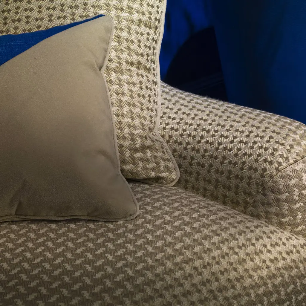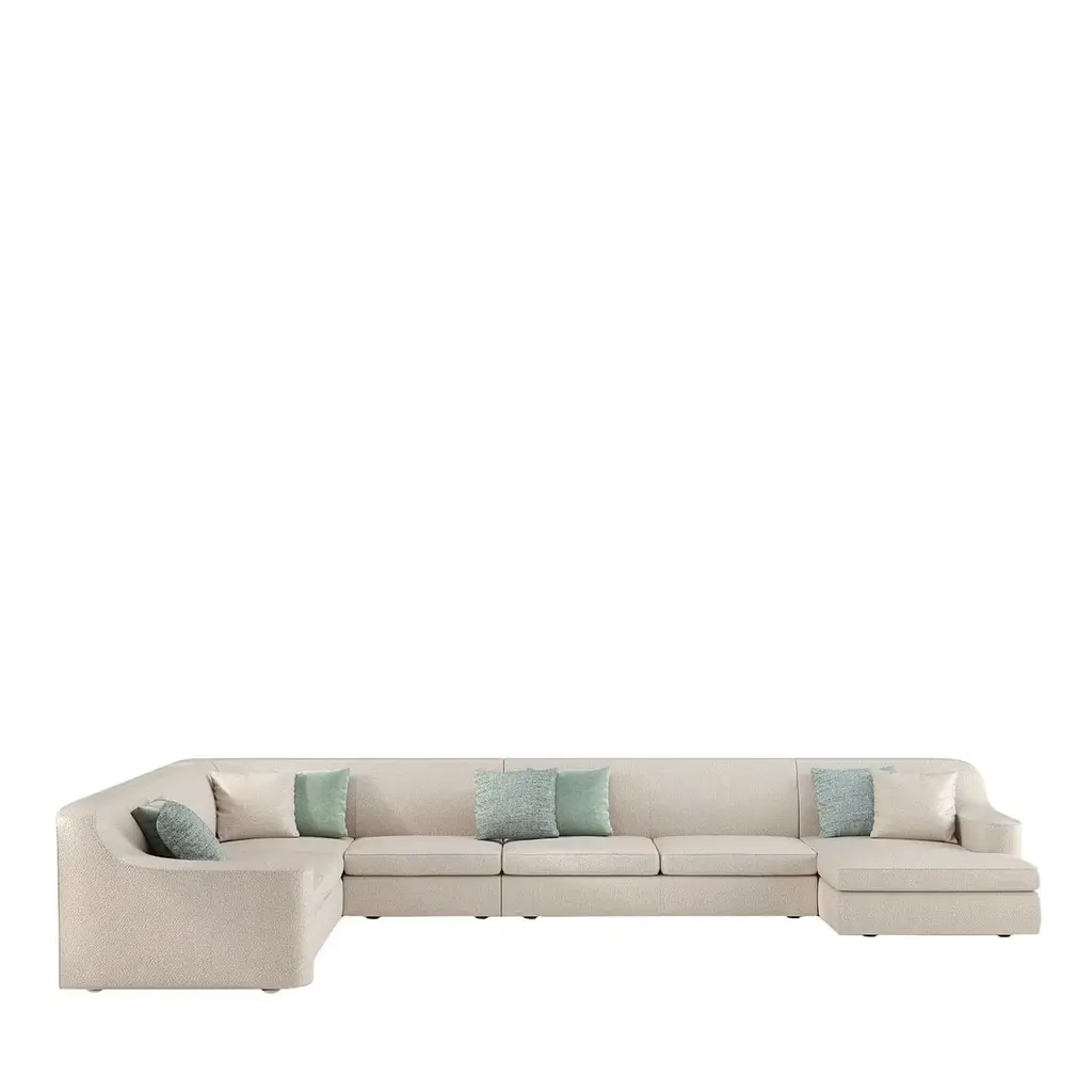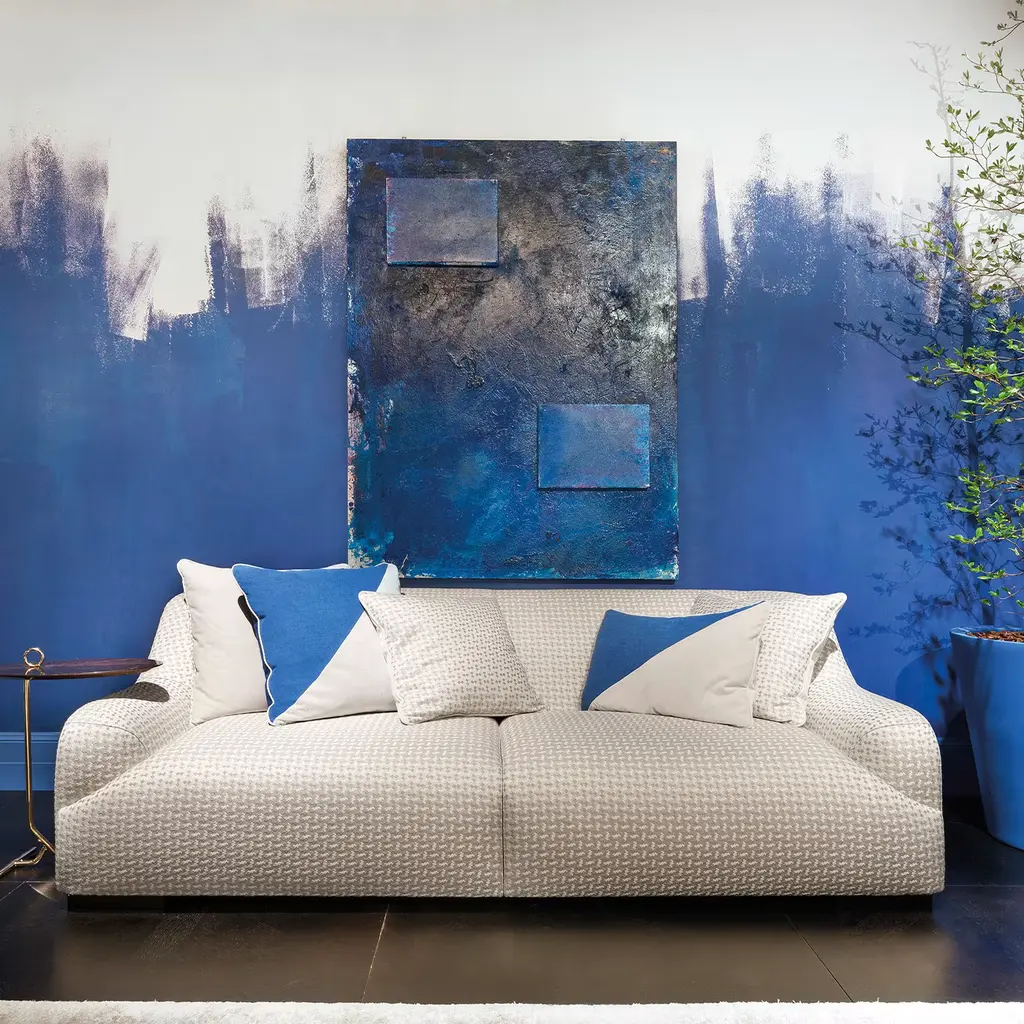 A modular sofa provided with two large and welcoming seats, this stupendous design is entirely upholstered with a first-rate jacquard fabric showcasing a striking luminous allure. Completed with five pillows (included), it is an invitation to utmost comfort and relaxation. Please refer to the Concierge for further details.