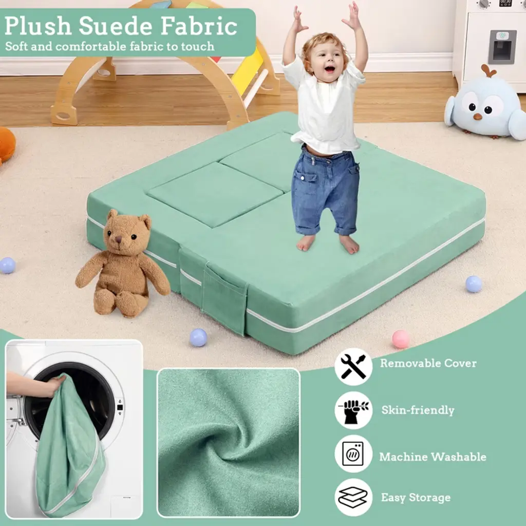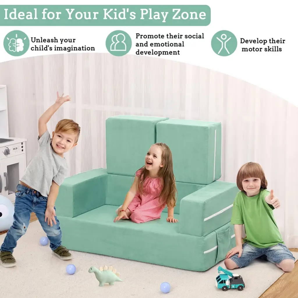 This kids' modular sofa features ultra-soft, durable suede fabric and high-density foam that keeps its shape while staying comfy for play. Perfect for ages 1-4, it easily converts into a table, mat, or other fun setups. The removable, machine-washable cover and lightweight, screw-free design make it safe and easy to maintain. Arrives vacuum-packed and expands fully within 2-3 days.